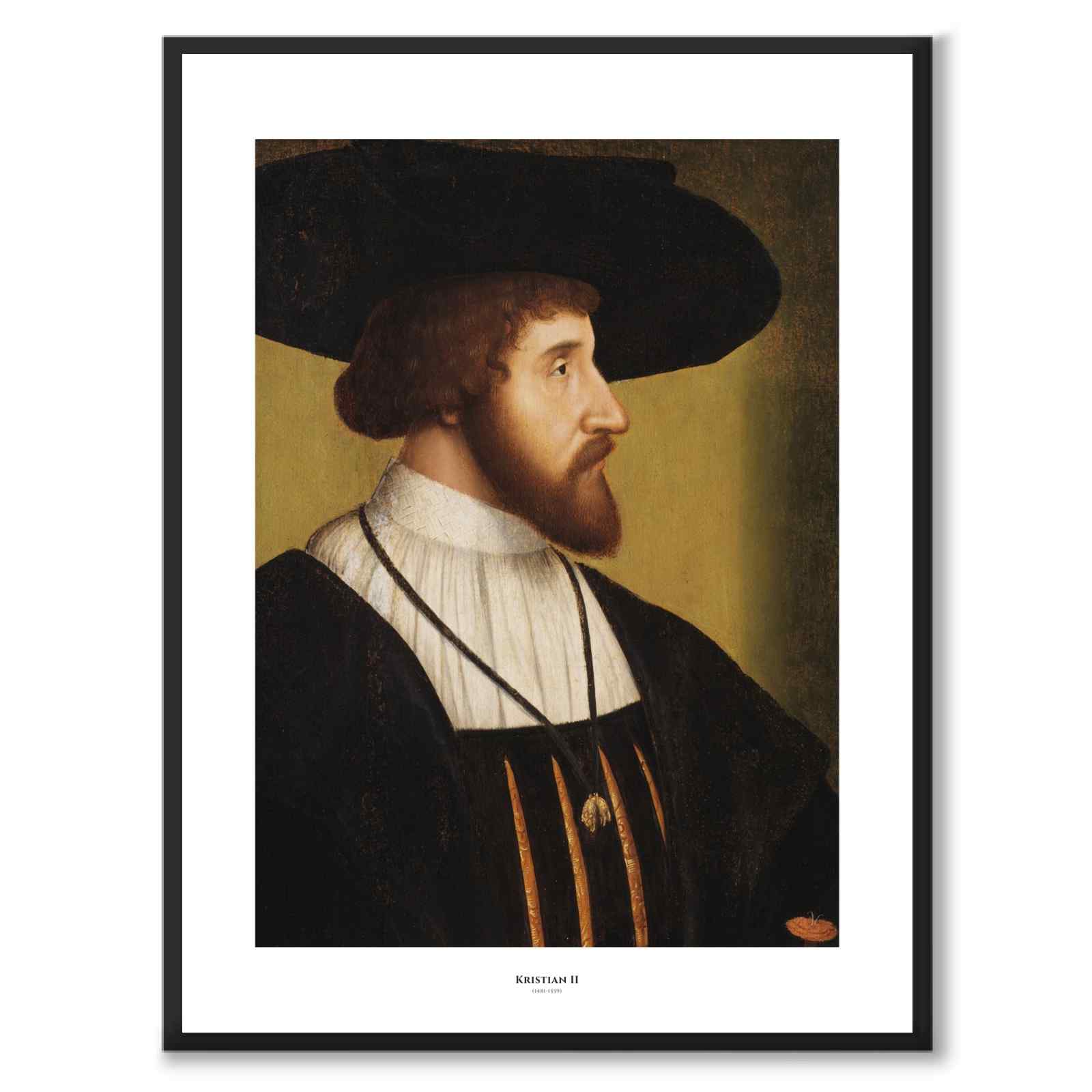 Plakat med et fantastisk portrett av kong Christian II , også kjent som den kristne tyrannen . Han var konge av Danmark og Norge 1513–1523 og konge av Sverige 1520–1521.