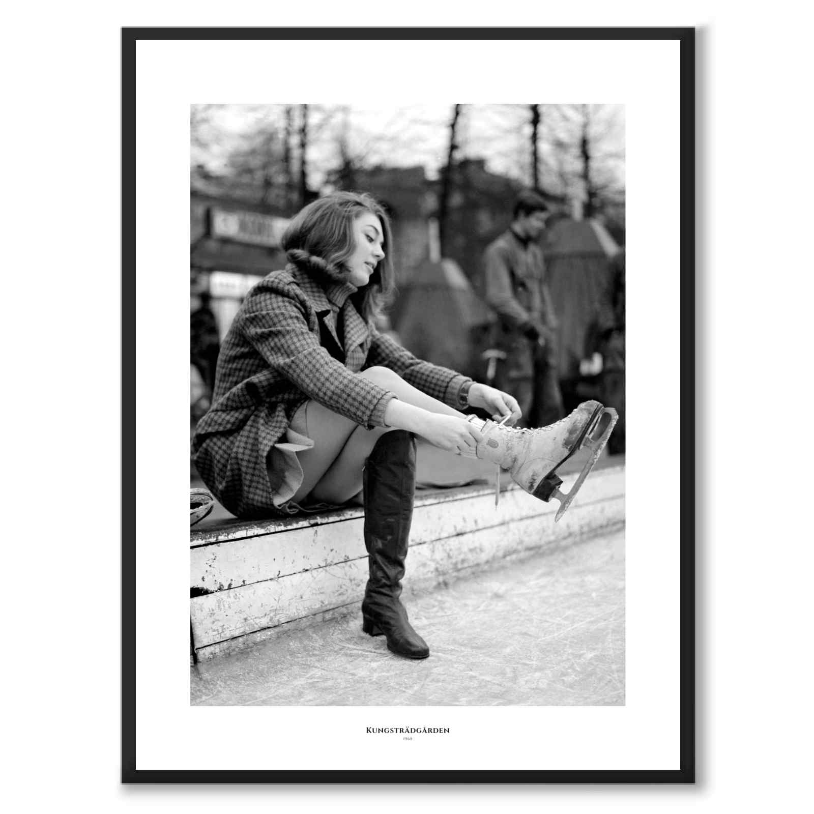Fotoet viser en ung kvinne som sitter på kanten av en skøytebane i Kungsträdgården og snører skøytene sine. Hun er kledd i kåpe og knelange støvler, noe som gir bildet en tydelig tidsfølelse fra 1960-tallet. I bakgrunnen skimtes andre mennesker og bymiljø i lett uskarphet. Bildet formidler et hverdagslig, avslappet vinterøyeblikk midt i Stockholm.