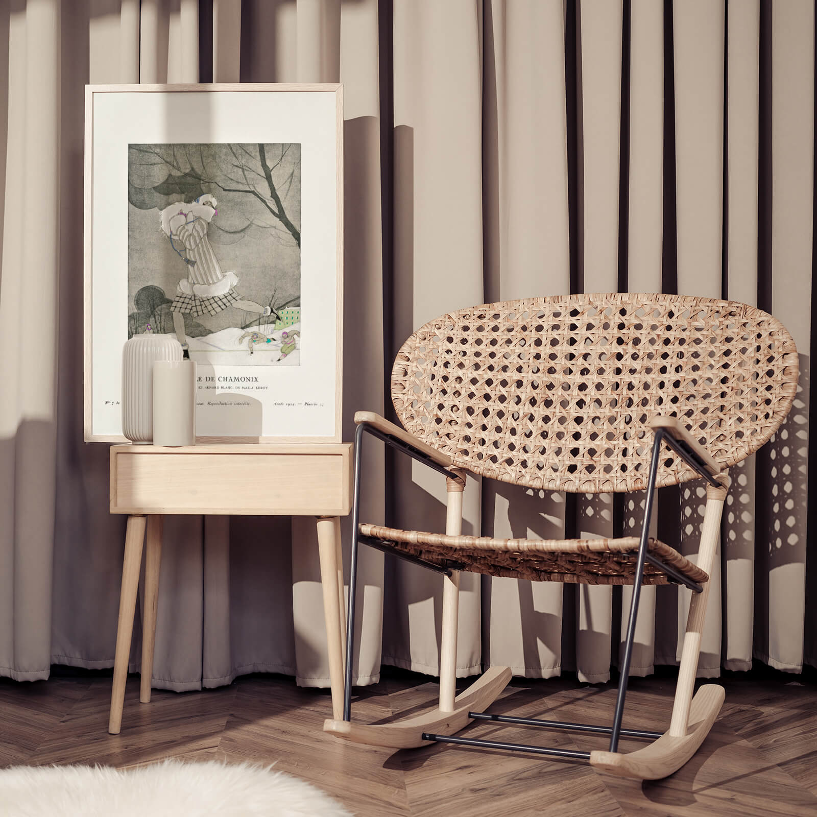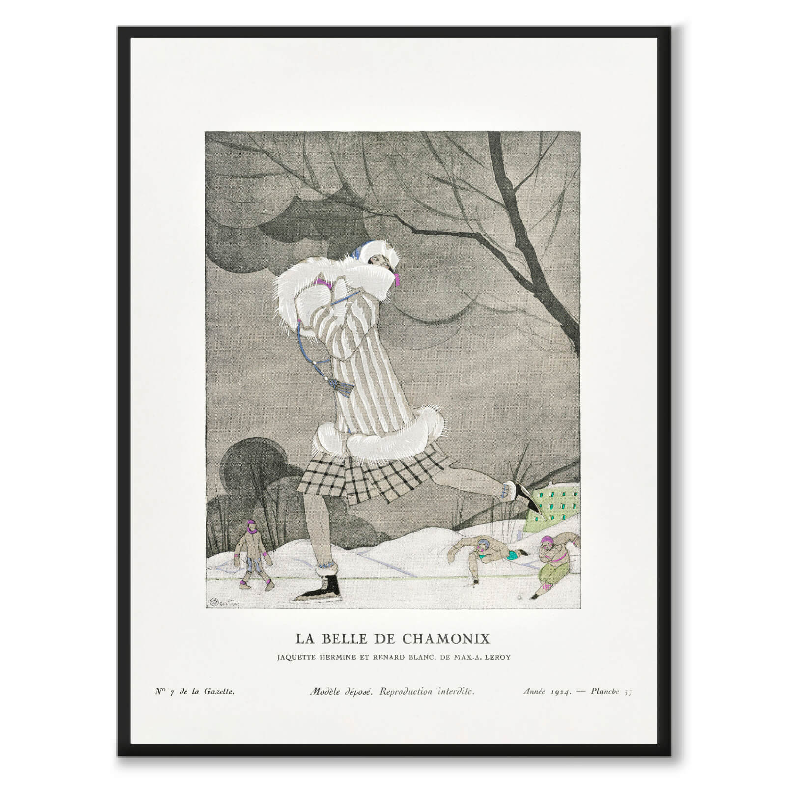 Plakat med moteillustrasjon av Charles Martin fra 1924. På illustrasjonen ser du teksten La Belle de Chamonix, Jaquette Hermine et Renard Blanc, De Max-A. Leroy. En vakker kvinne går på skøyter i det populære skistedet Chamonix i Frankrike.