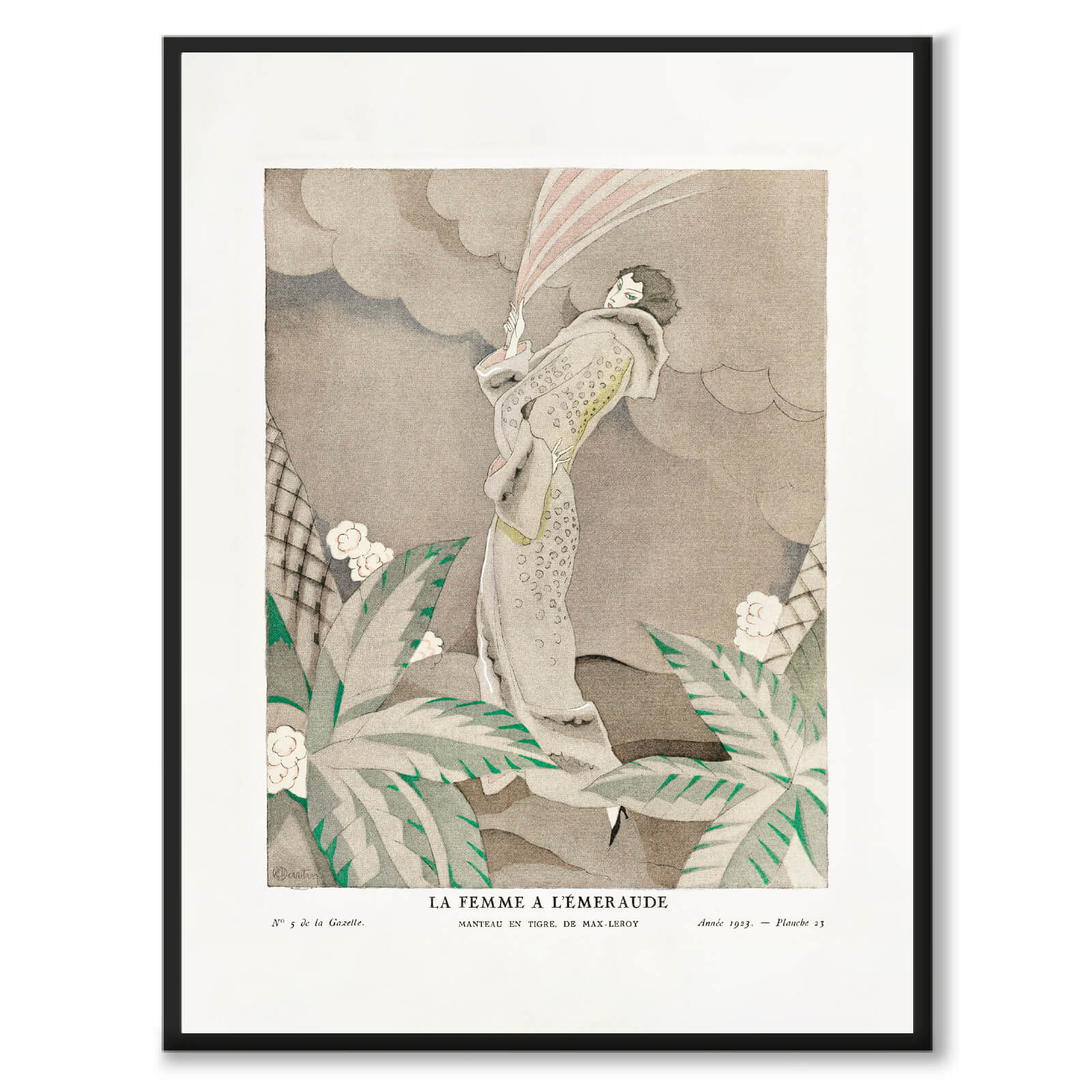 Plakat med moteillustrasjon av Charles Martin fra 1923. På illustrasjonen ser du teksten La femme a l'émeraude, Manteau en tigre, de Max-Leroy. En kvinne i vakker frakk står blant palmer, grønne blader, hvite blomster og en nøytral, beige bakgrunn.