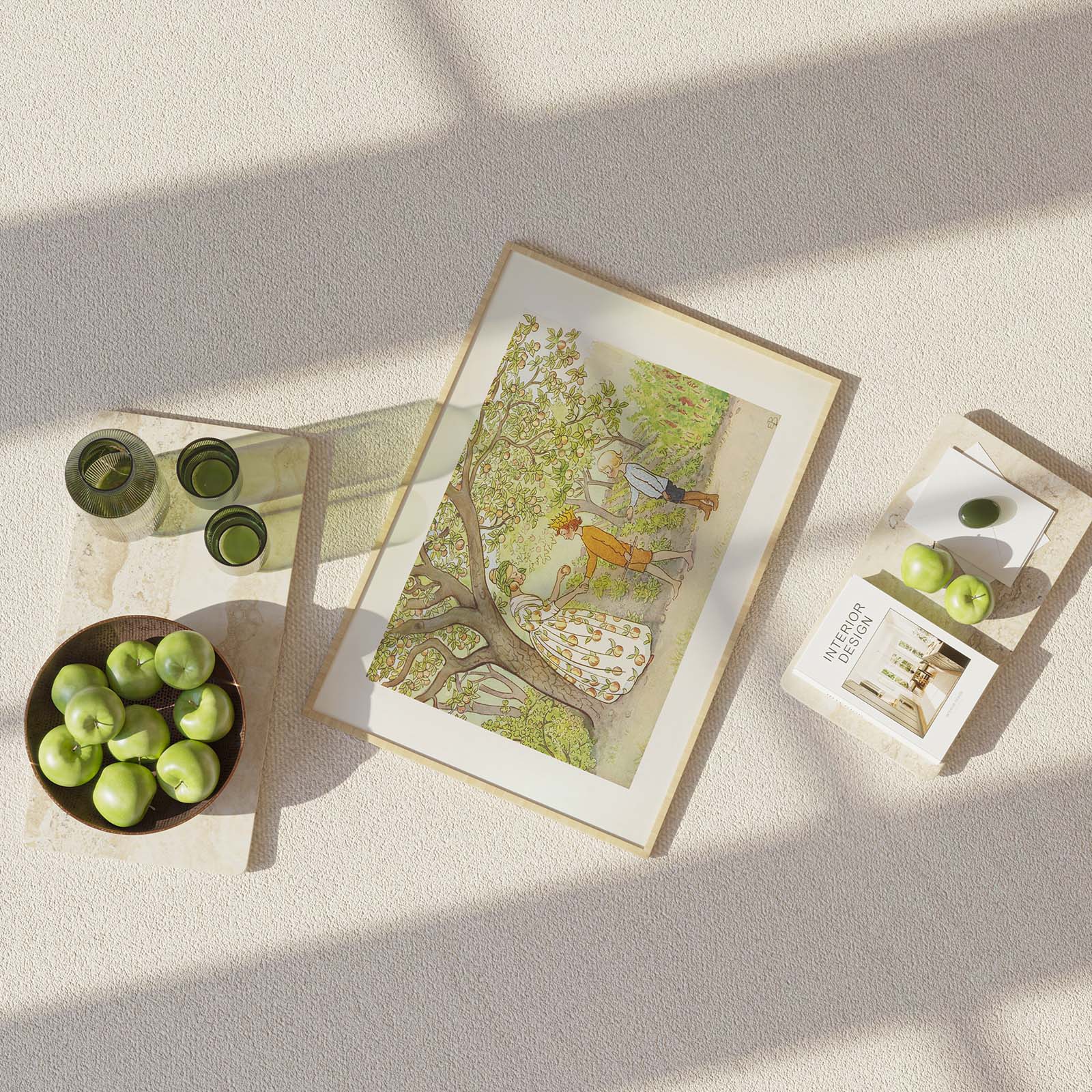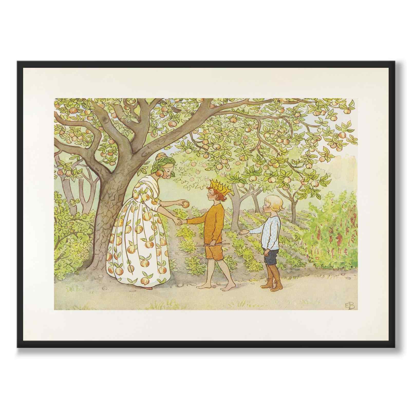 Plakat med illustrasjon fra Lasse-liten i trädgården, en av Elsa Beskows mange kjære barnebøker fra 1923. Motivet heter Epletreets sang. Lille Lasse og vennen September møter epletreet personifisert av en vakker ung kvinne.