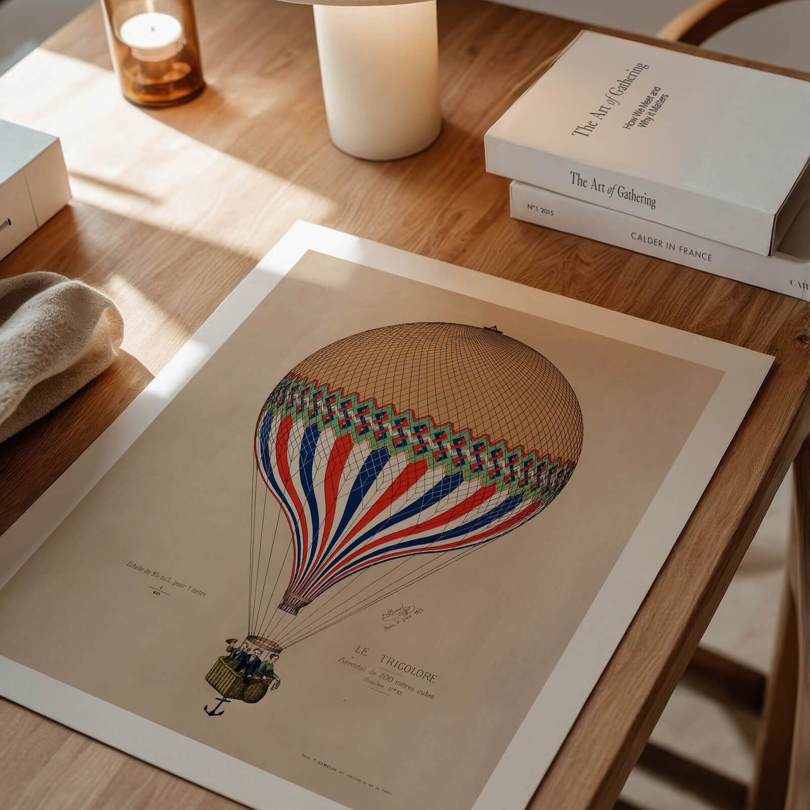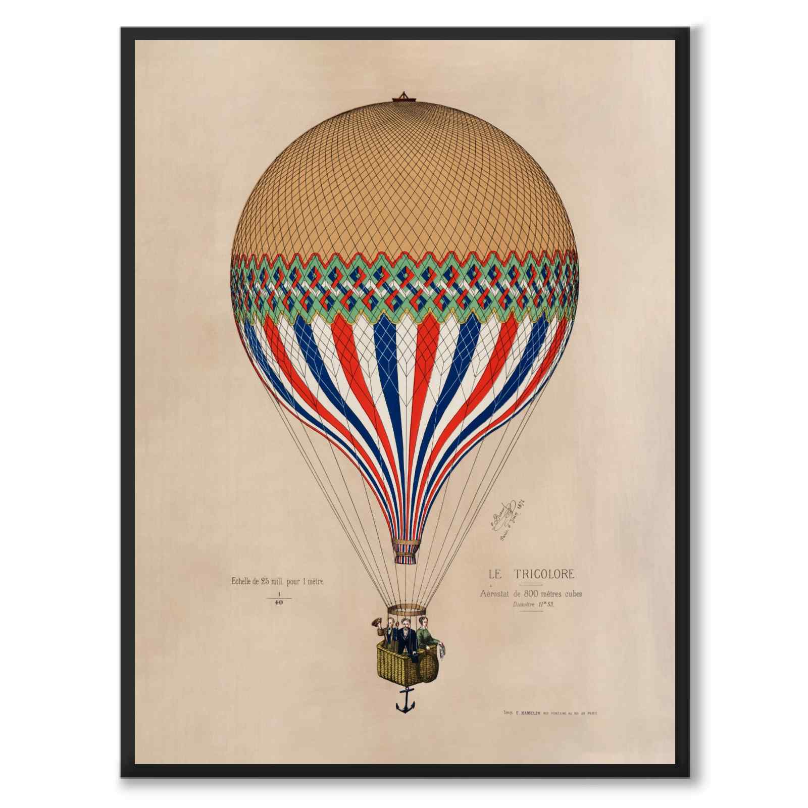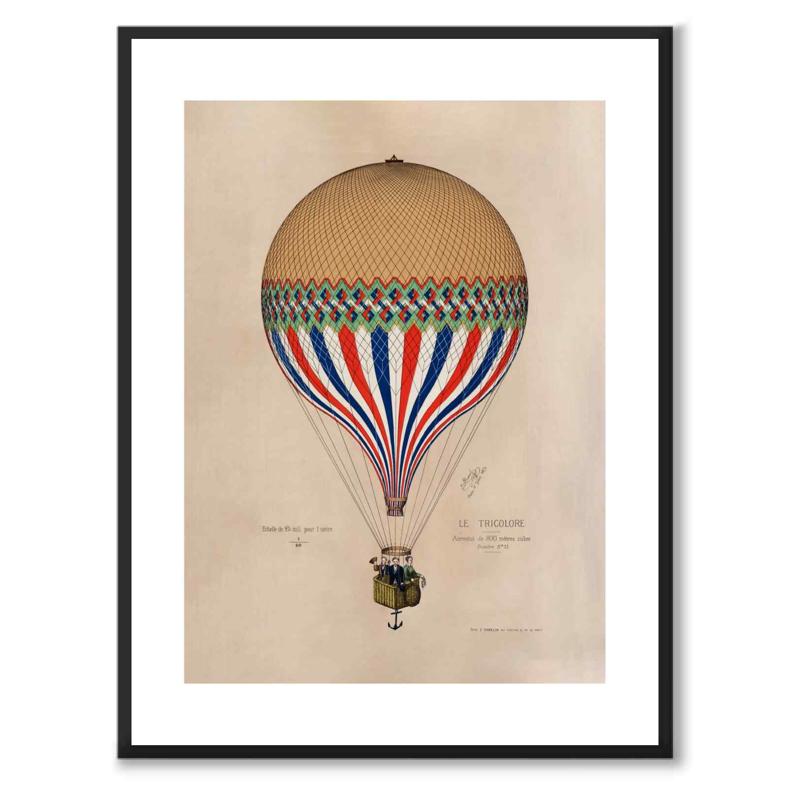 Plakat med en gammel illustrasjon av den franske luftballongen Le Tricolore .