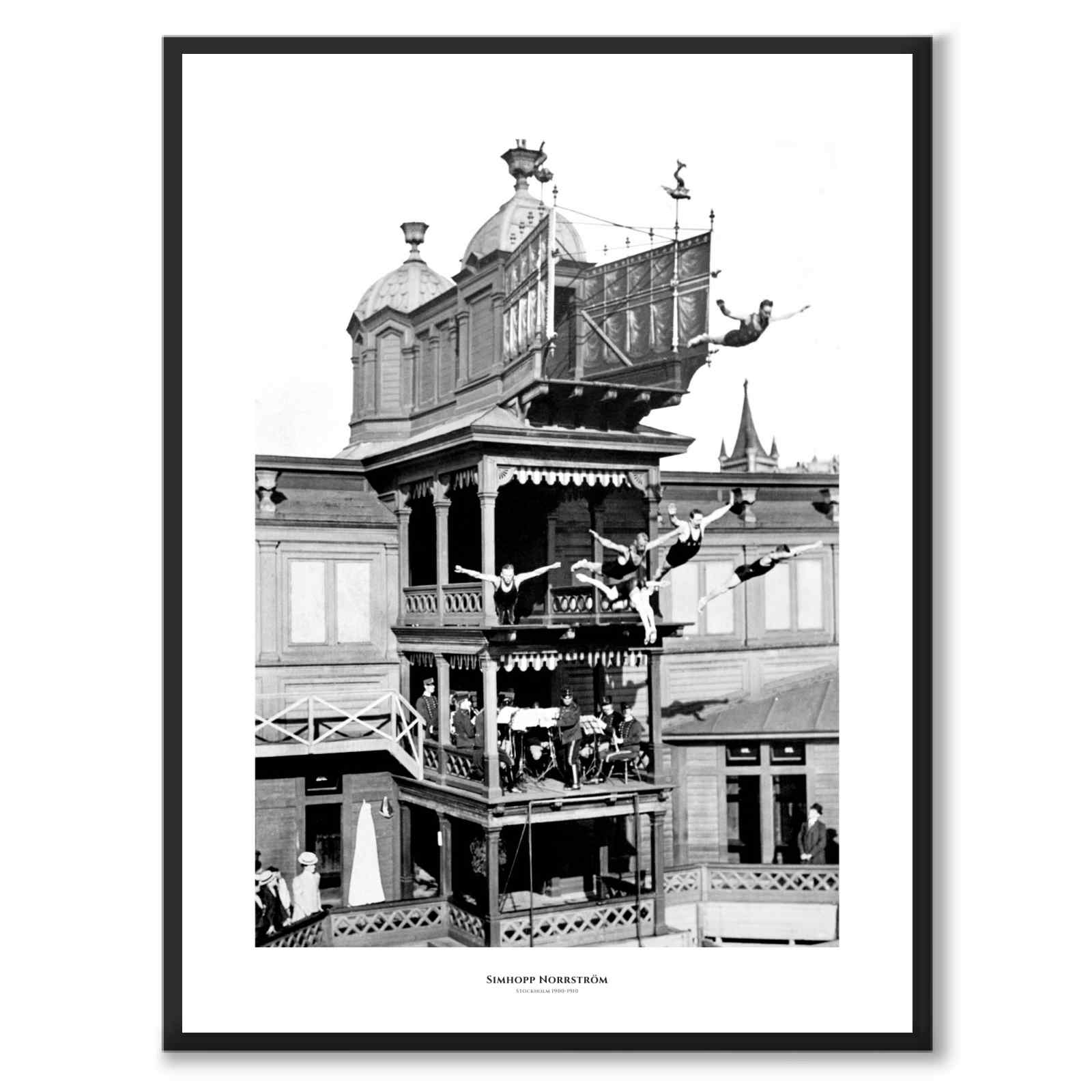 Strömbadet var det første kaldbadehuset i Stockholm og lå på vannet foran Rådhuset. Det var en vakker bygning, bygget i renessansestil og skal fungere for stockholmernes helse- og svømmeferdigheter. Skolebarn, politifolk og brannmenn hadde gratis inngang, for andre besøkende var inngangen 35 öre. Svømmebassenget hadde en avdeling for kvinner, en for unge gutter og det største, vestlige bassenget for menn som kunne svømme. Det er denne avdelingen du ser på bildet. Strömbadet var arena for flere store svømmekonkurranser. På bildet ser du en dykkervisning en gang mellom årene 1900-1910. Et imponerende fotografi av Axel Malmström som viser menn samtidig som gjør forskjellige avanserte svømmehopp. En mann hopper med ryggen til oss: et avansert hopp som ser ut til å være i spar. På bildet ser du også et orkester som spiller på det andre flyet.