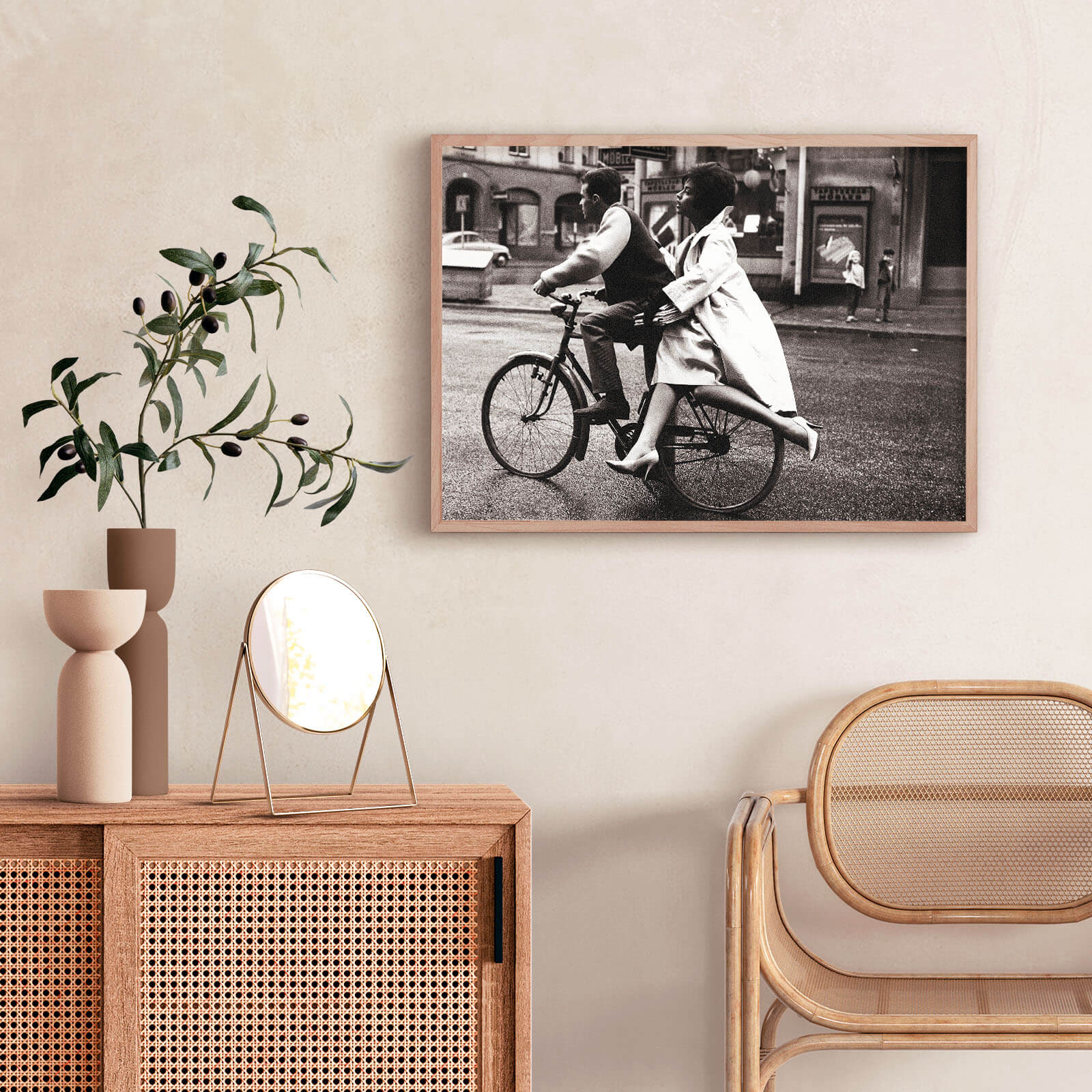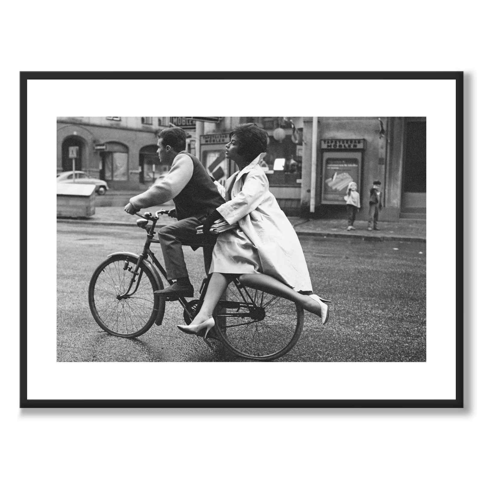 Plakat med bilde av Lill-Babs Svensson, svensk sangerinne, her iført hvit lys frakk og høyhælte sko sittende på sykkelstativet. En ung mann sykler bort med henne langs en gate i Stockholm i 1961 og i bakgrunnen sees to små barn vinke til kameraet.