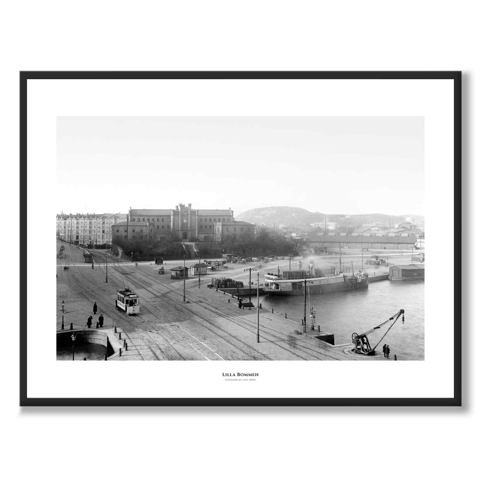 En ro ligger over Lilla Bommen i Gøteborg. Bildet er tatt ved århundreskiftet og har en fin detaljrikdom. Vi ser blant annet en gammel trikk som passerer mellom dampbåter og folk i byen. Gøteborgs trikkenett ble elektrifisert mellom 1900-1902 så bildet må være fra kort tid etter det. Bygningen midt i bildet ble revet på 60-tallet og i forbindelse med det ble også bakken sprengt. I dag går stien rett over.