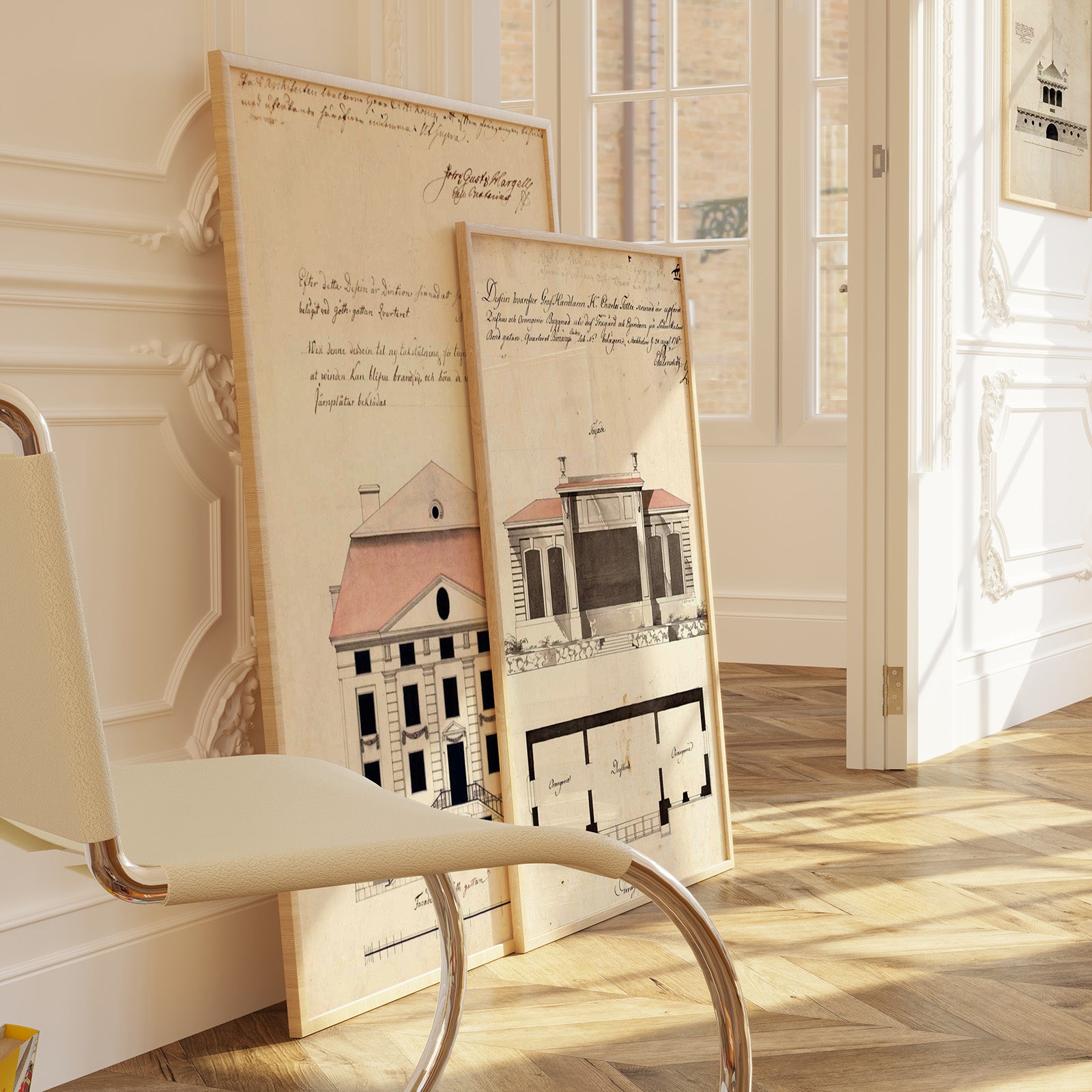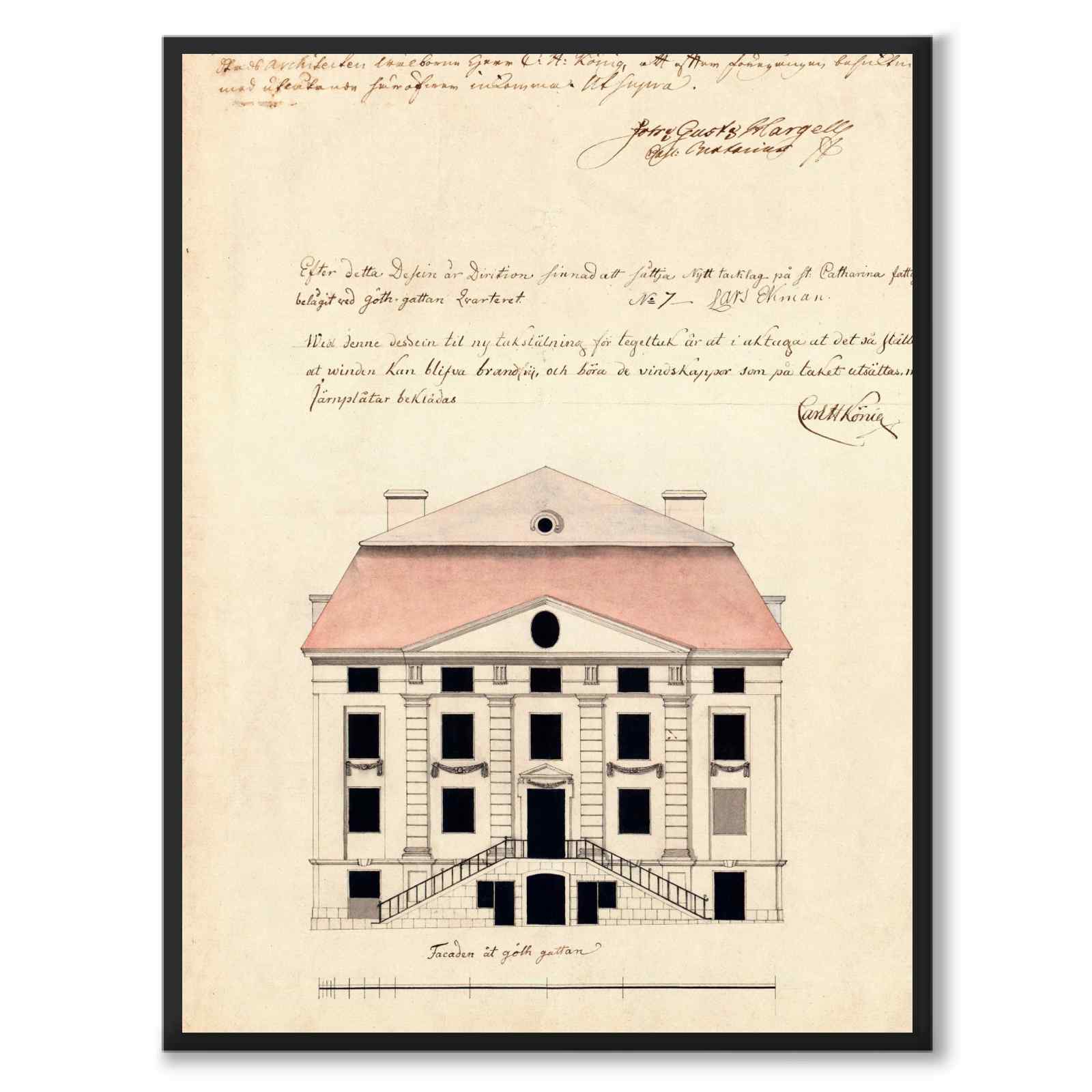 Plakaten viser en tegning av Lillienhoff-palasset, som ligger på Götgatan ved Medborgarplatsen i Stockholm. Bygningen ble reist i 1670 og er et av de eldre palassene i byen, noe som gjør det til en viktig del av Stockholms arkitekturhistorie.