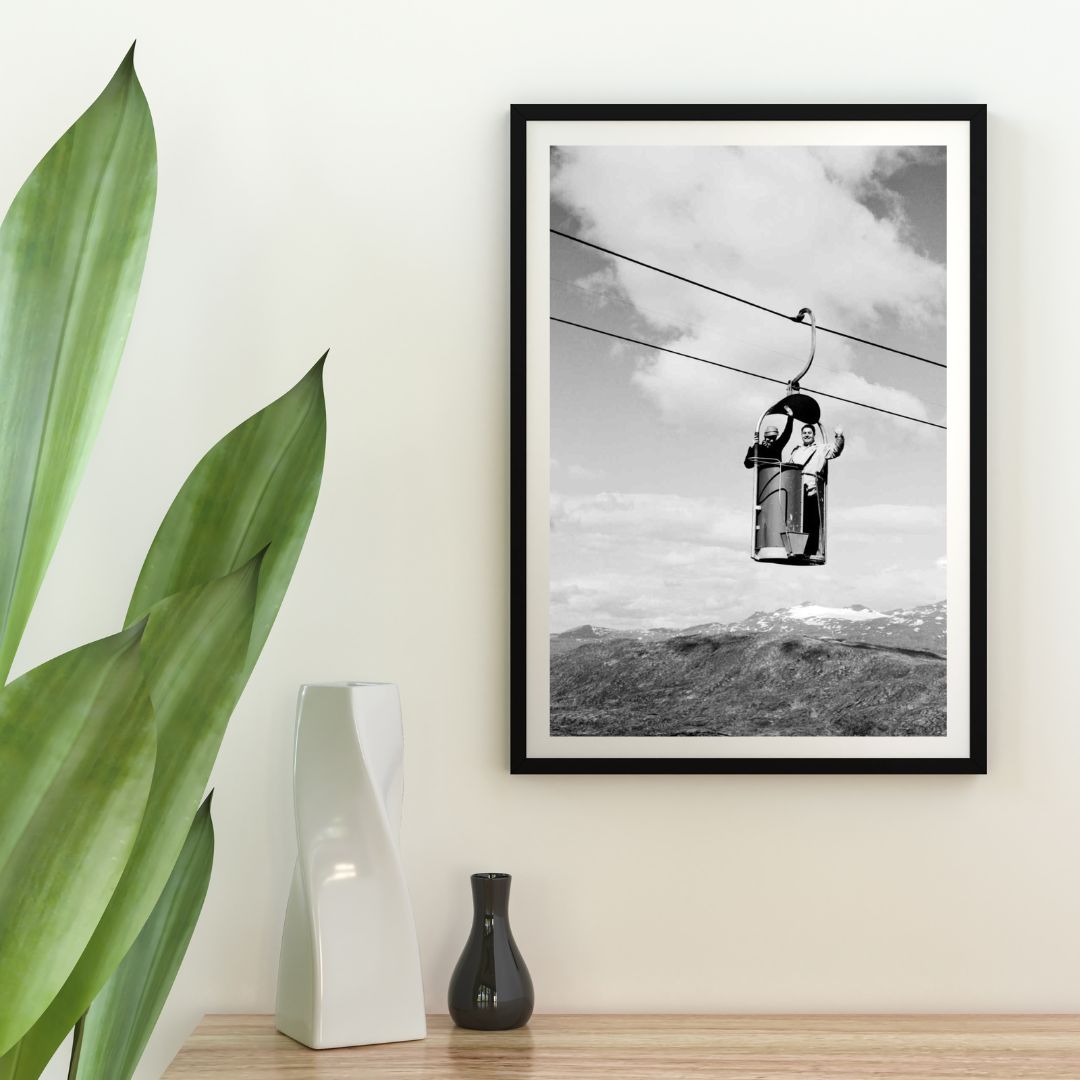 Plakat med motiver fra taubanen ved Riksgränsen, innviet i 1956. Taubanen var en banebrytende bragd innen svensk skiindustri og turisme. Som en av landets første taubaner spilte den en nøkkelrolle i å gjøre Riksgränsen til et fremtredende reisemål for vintersportsentusiaster.