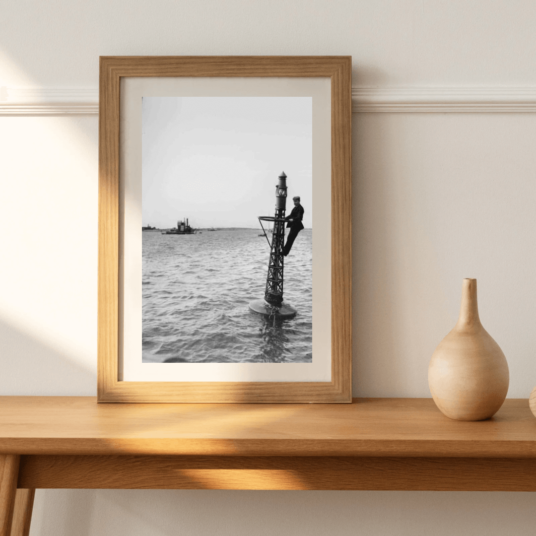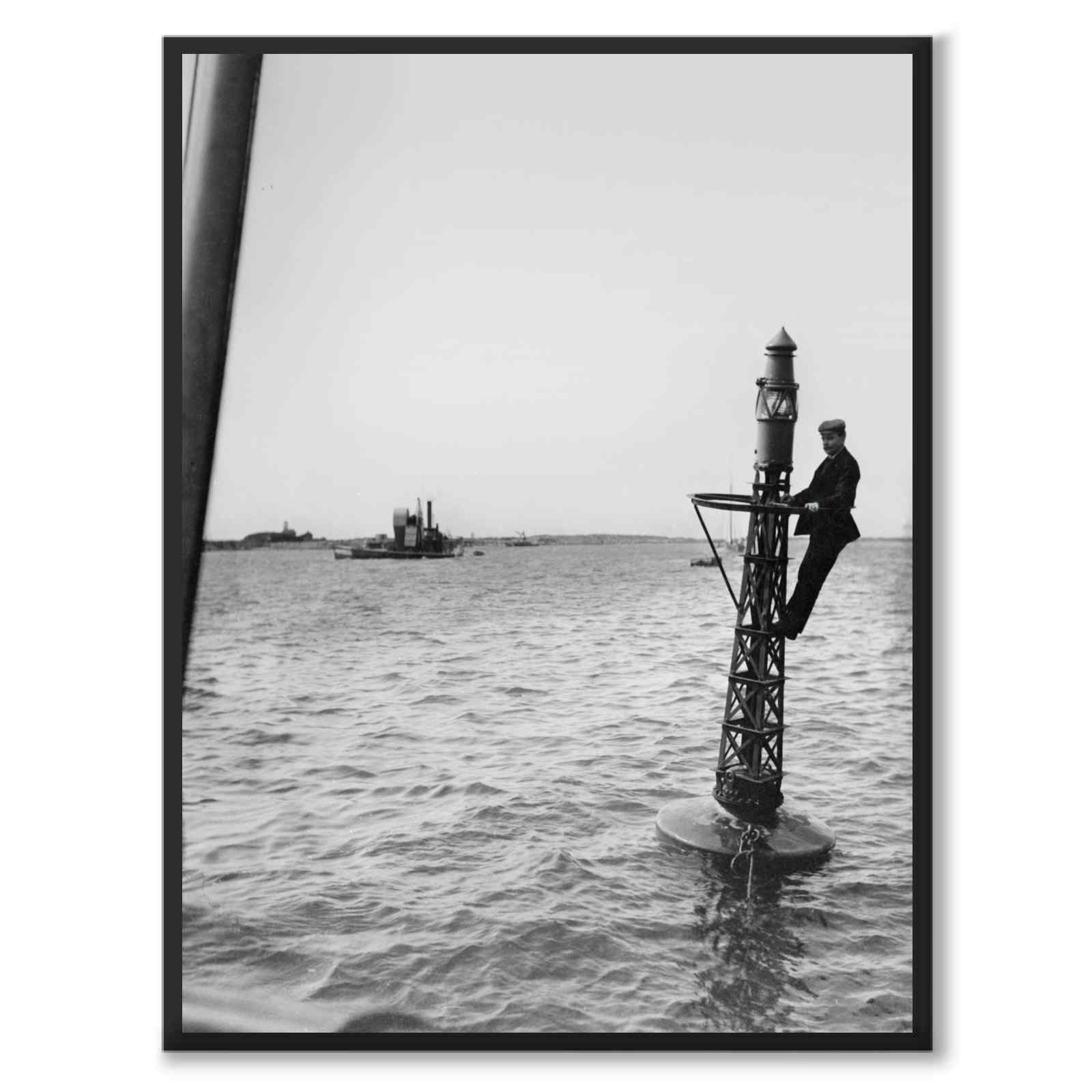 Plakat med motiv av en lysbøye ved Yttre Stengrund tidlig på 1900-tallet. En mann i dress og beret står på lysbøyen og undersøker den.