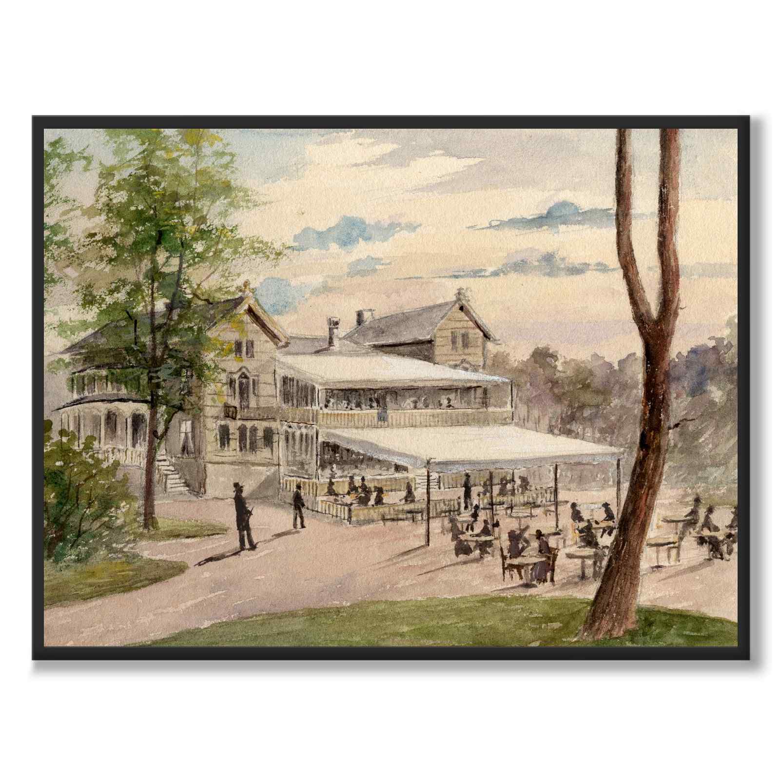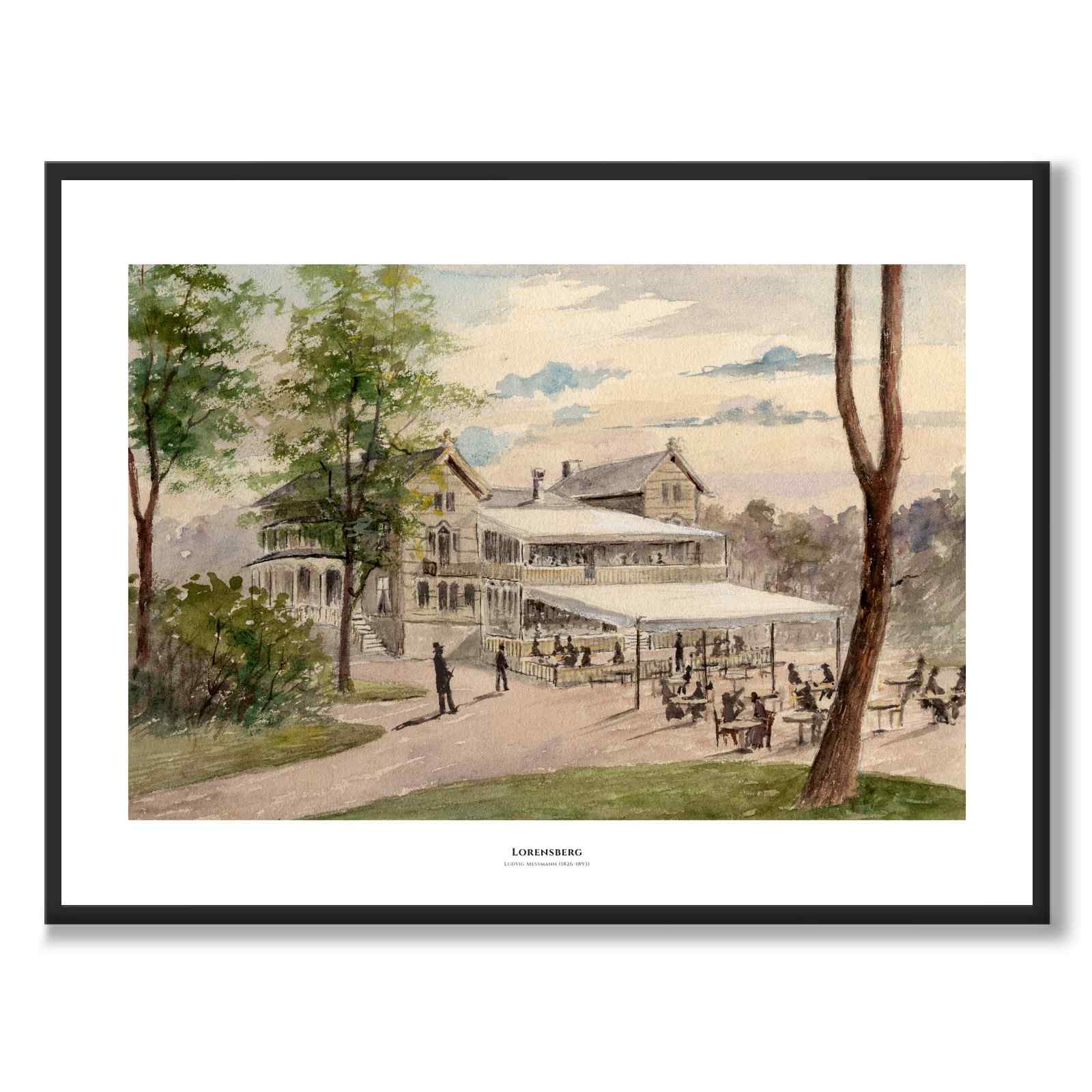 Plakat med et vakkert maleri av Lorensberg med tilhørende veranda og uteservering i Gøteborg. Kunstverket ble skapt av den danske kunstneren Ludvig Messmann i 1890 og er en del av en hel serie vakre Gøteborg-motiver.