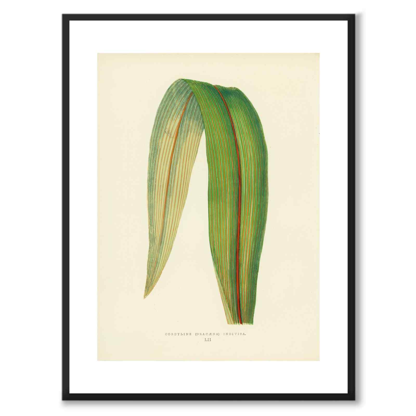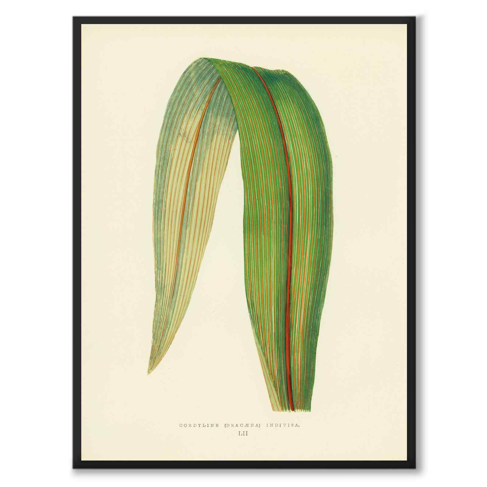 Denne klassiske illustrasjonen viser et blad av den populære potteplanten Praktdracena . Under illustrasjonen ser vi dets latinske navn Cordyline (Dracæna) Indivisa . En tidløs interiørdetalj som passer til ethvert hjem.