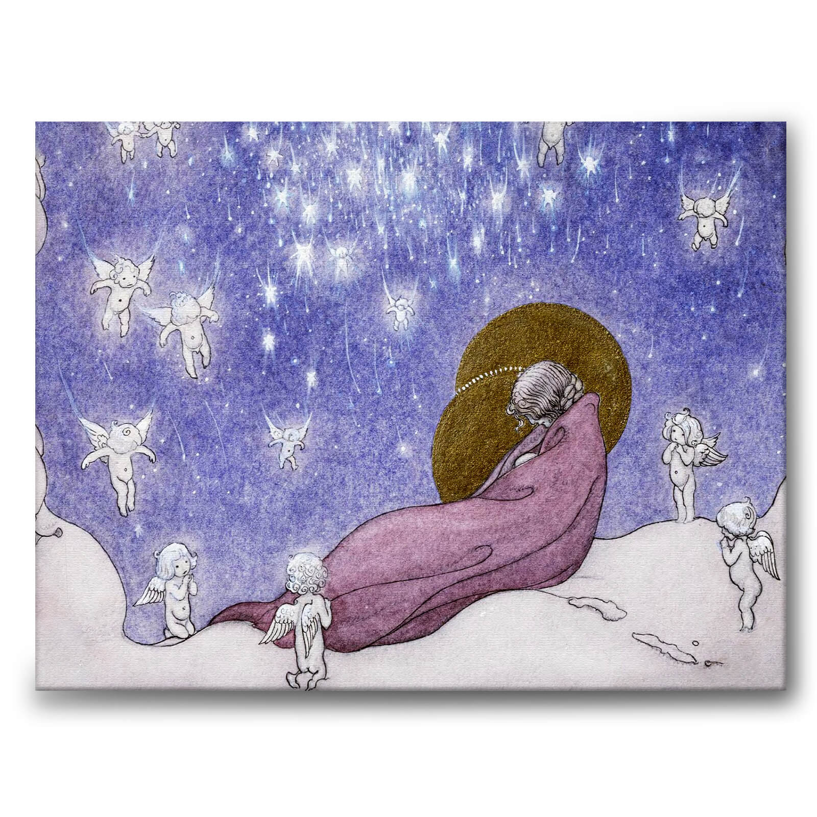 På bildet ser vi vakre Maria ligge i snøen med den rosa kåpen en vinternatt. Fotsporene hennes i snøen vitner om at hun har vært ute på tur for å endelig legge seg ned og hvile. Hun holder barnet sitt i armene og på himmelen ser vi en dusj av stjerner som ved nærmere ettersyn viser seg å være engler som kommer ned for å våke over henne.