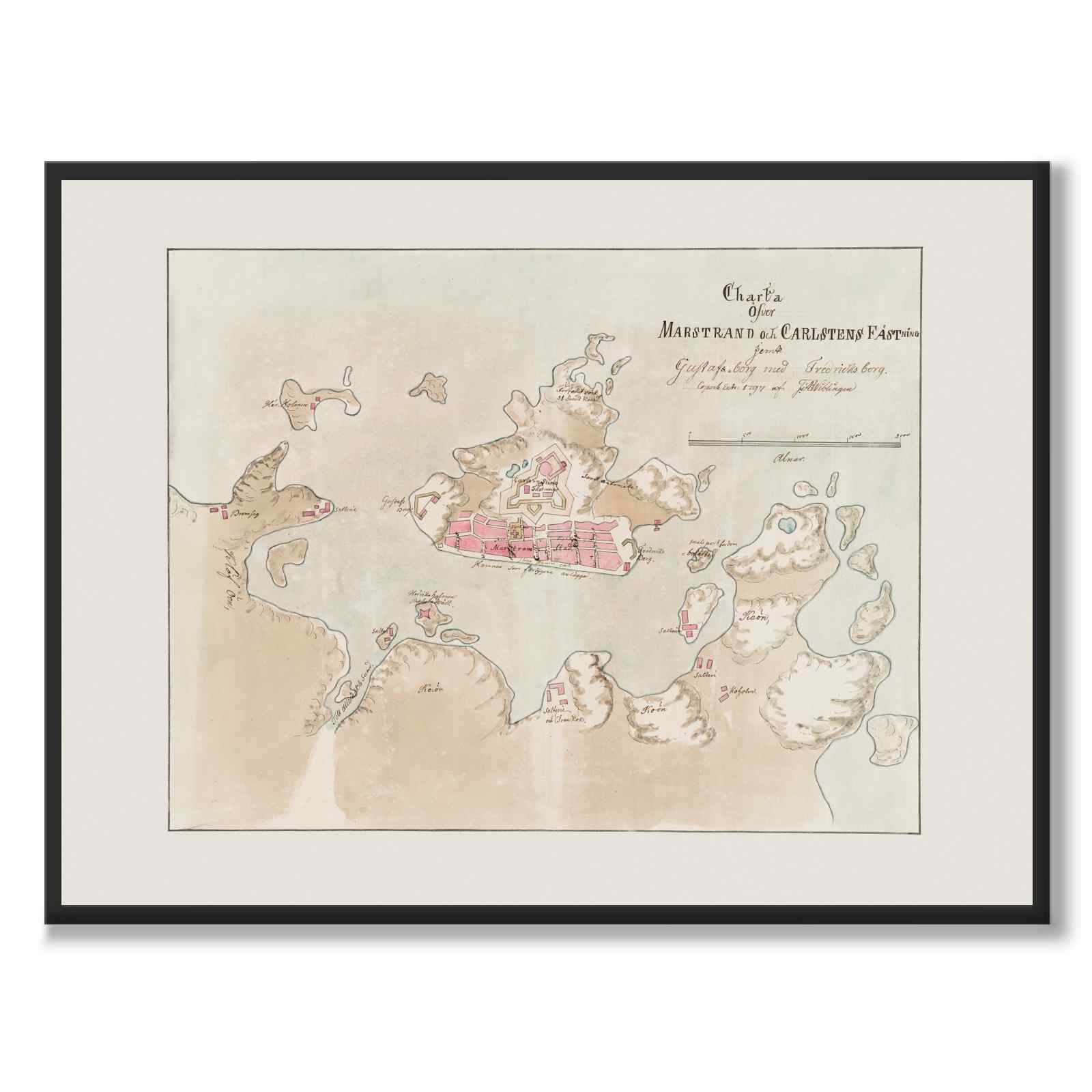 Plakat med et vakkert, vintage kart over Marstrand fra 1797. I øvre høyre hjørne ser vi teksten: Charter of Marstrand og Carlstens Festning - som altså er området kartet viser.