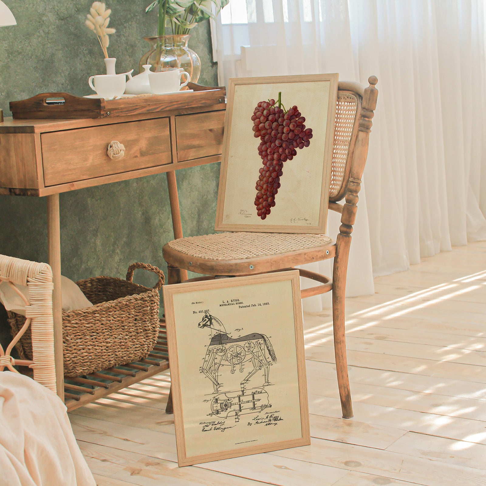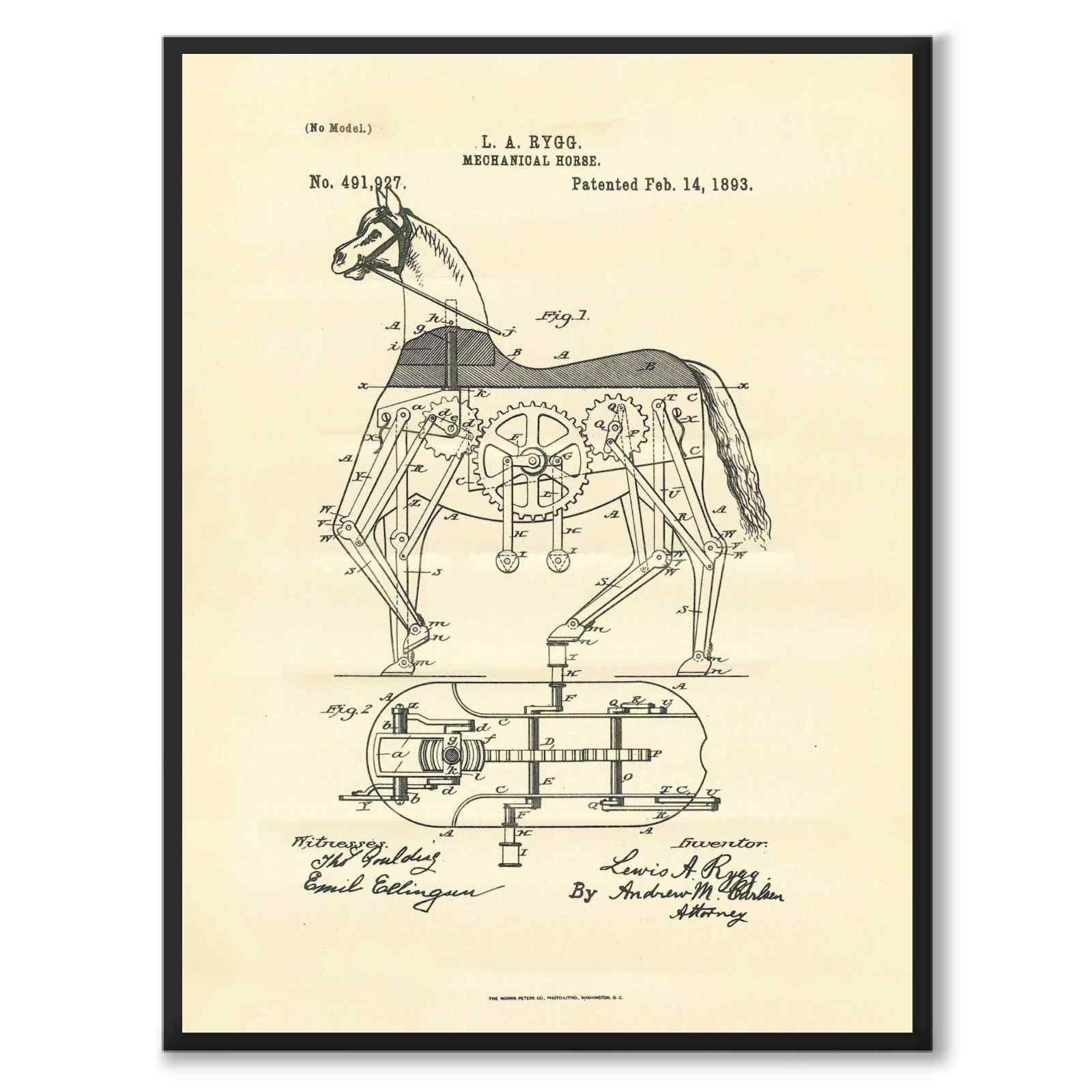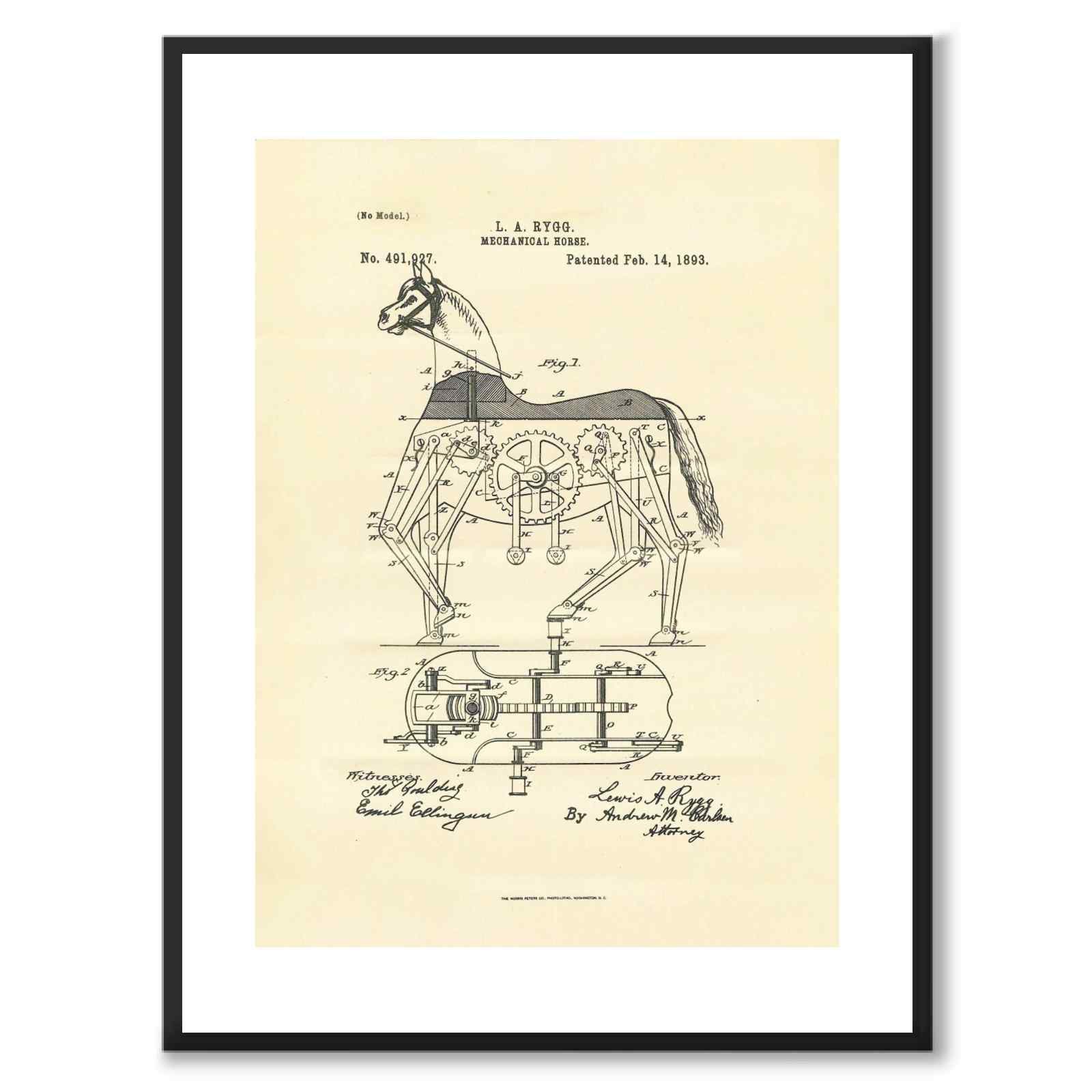 Plakat av en gammel patenttegning for en mekanisk hest, designet av LA Rygg og patentert 14. februar 1893.
