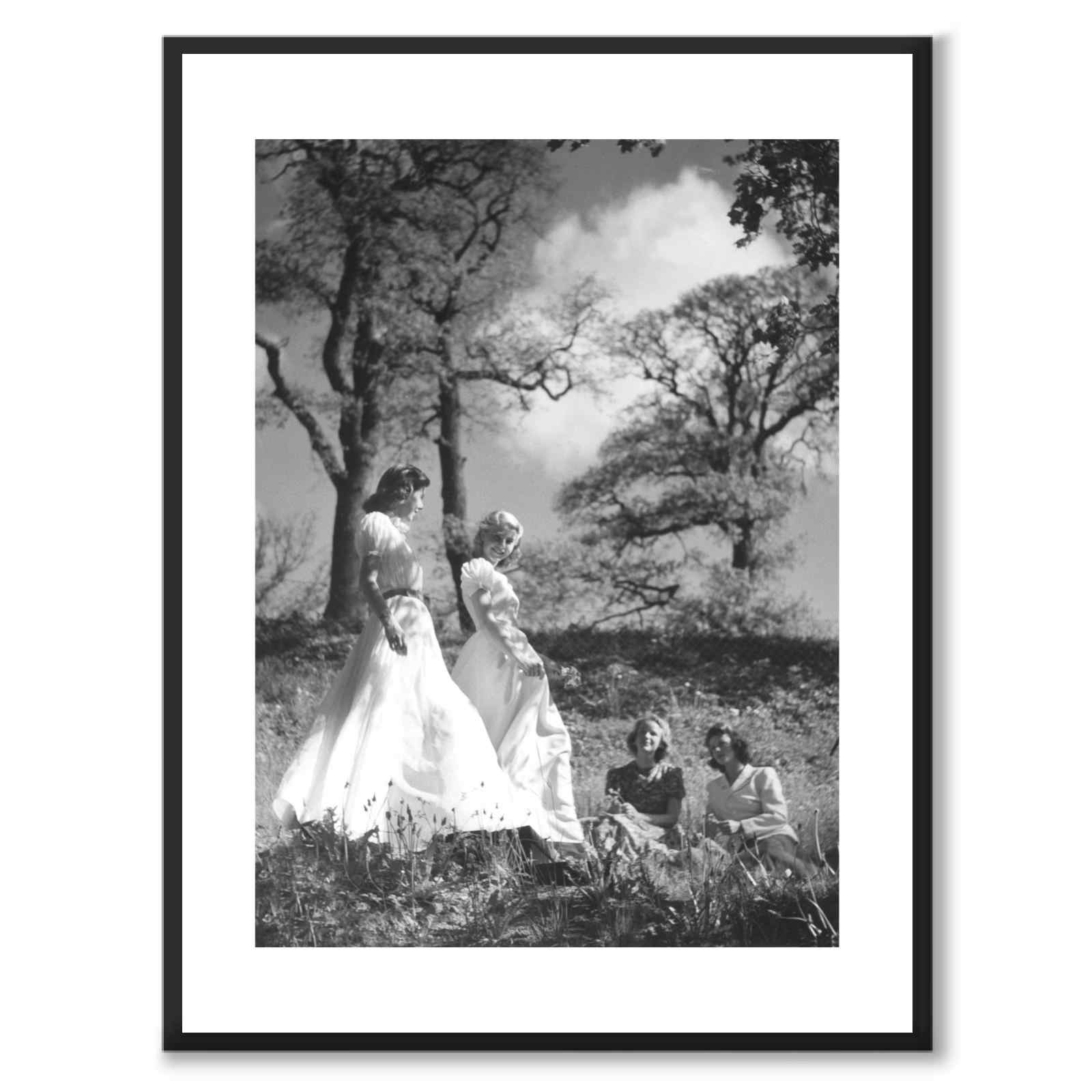 Plakat med svart-hvitt fotografi av to vakre kvinner i hvite kjoler på vei til sankthansfeiringen i 1940. På bildet ser vi ytterligere to kvinner sitte i det gjengrodde gresset.