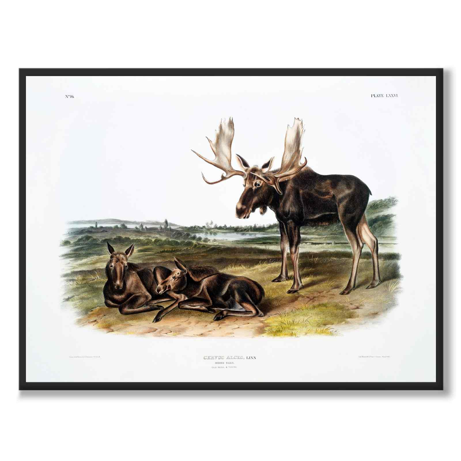 Plakat med gammel illustrasjon av en elgfamilie fra 1845. På bildet ser vi en elgokse, elgku og elgkalv i åpent landskap.