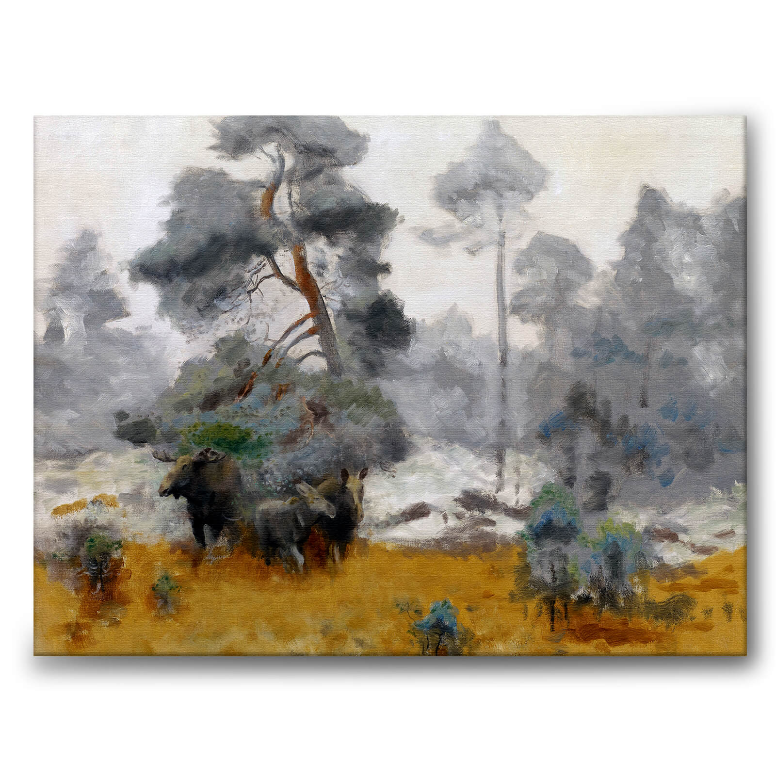 Lerret med maleri av Bruno Liljefors som viser et impresjonistisk landskap og en elgfamilie i en lysning i skogen.