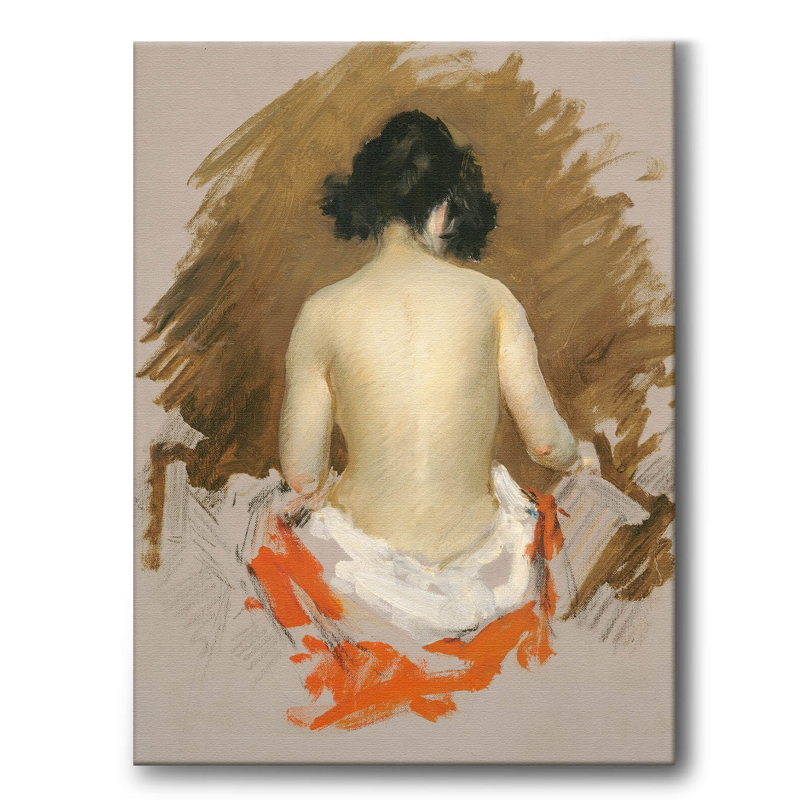 I det vakre bildet ser vi bakpanelet til en naken, sittende person med en hvit og oransje farget klut pakket over nedre del av kroppen. Chase har malt bakgrunnen i brune toner og de synlige penselstrøkene er effektive for maleriet.