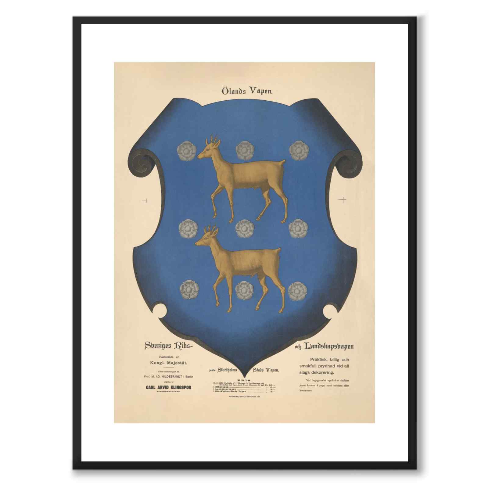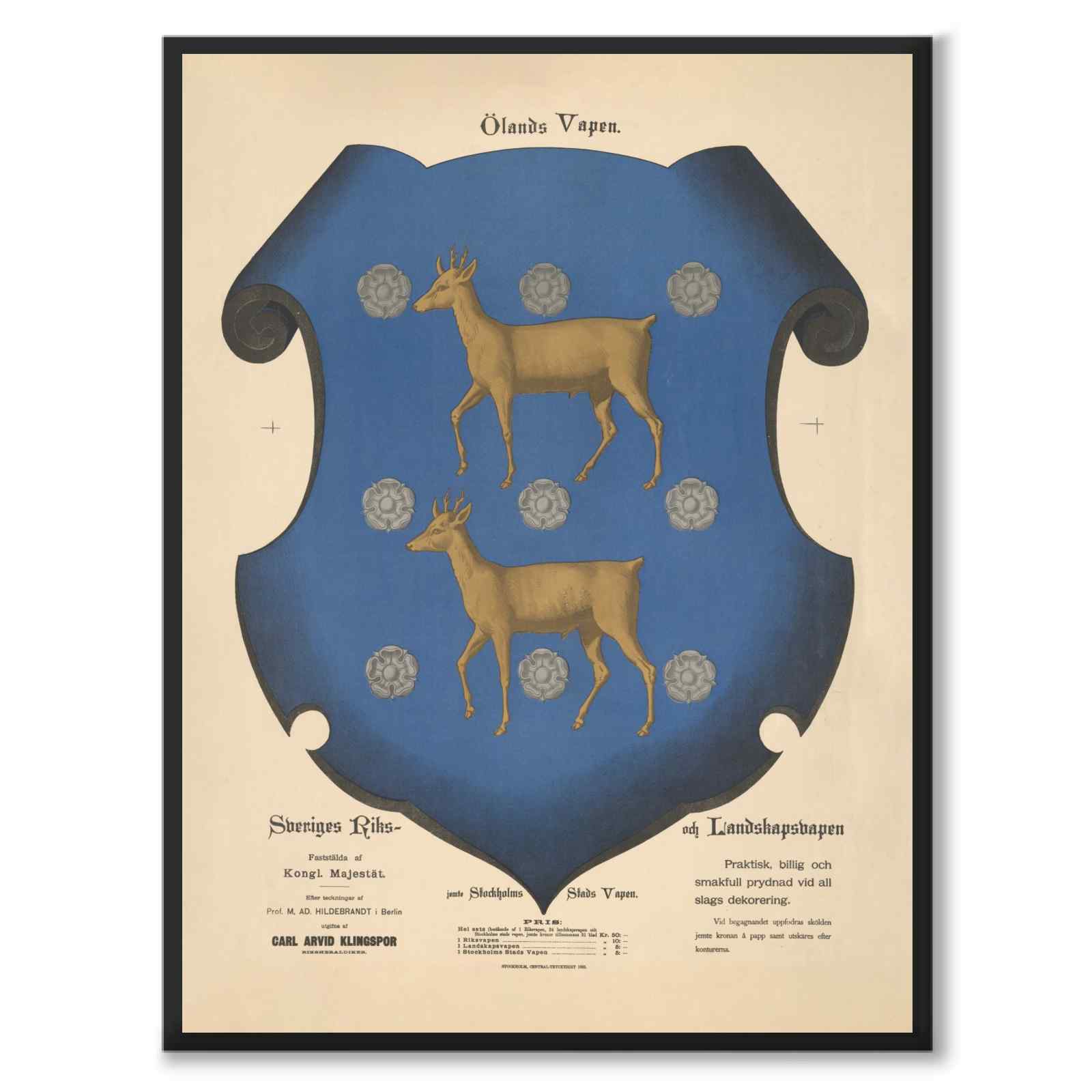 Teksten over våpenskjoldet lyder: Coat of Arms of Öland . Nederst til venstre står det: "Sveriges National- og Landshapensvapen. Etablert av Kongelig Majestet. Etter tegninger av prof. M. AD. Hildebrandt i Berlin. Utgitt av Carl Arvid Klingspor."