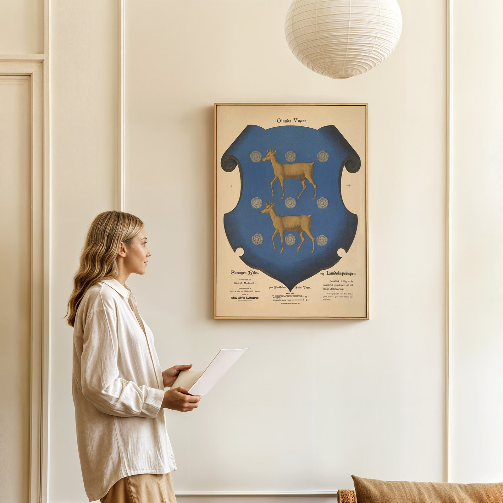 En vakker tegning med det heraldiske våpenskjoldet for provinsen Öland fra 1800-tallet. I våpenskjoldet ser vi to rådyr mot blå bakgrunn.