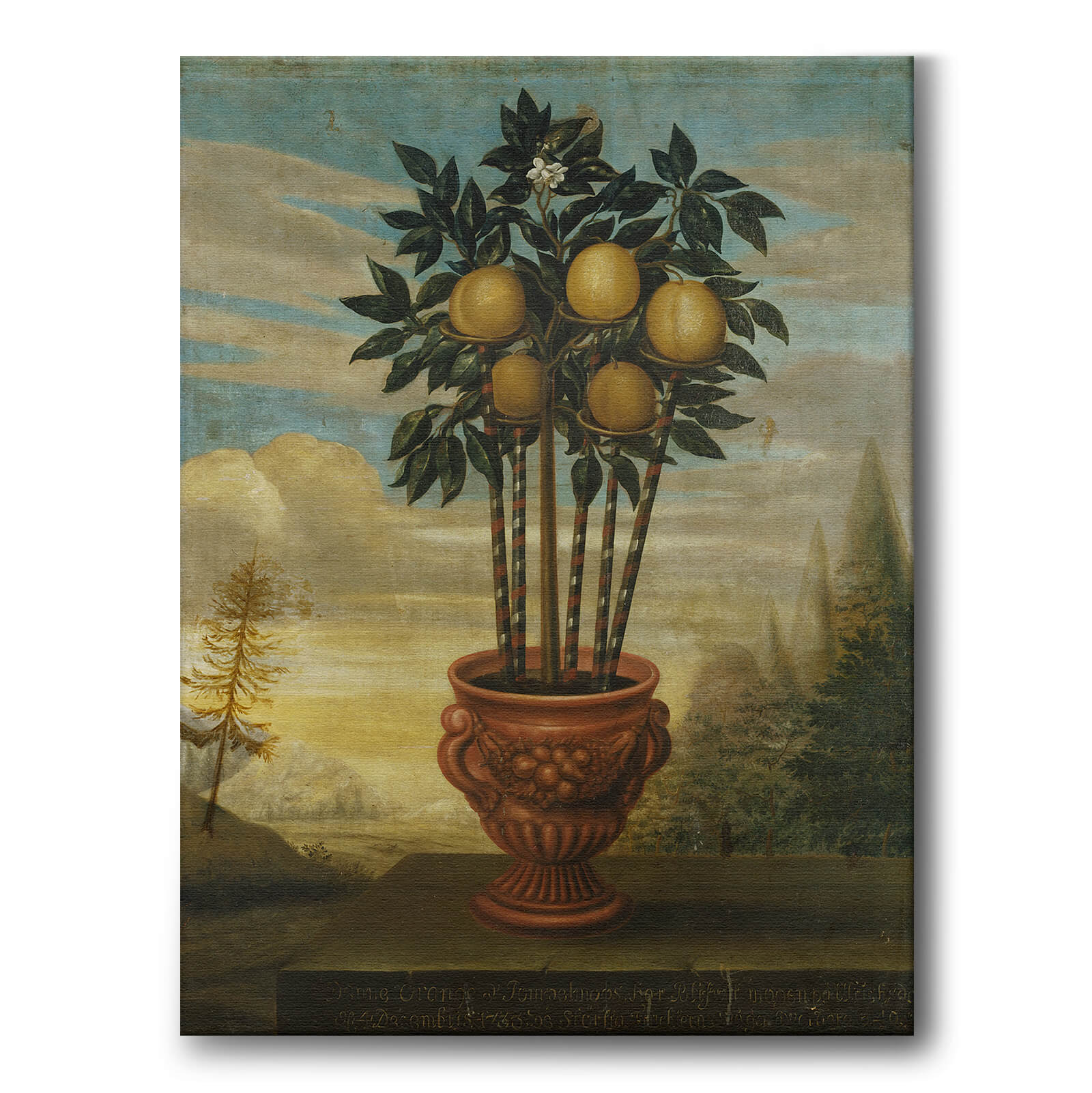 Lerret med maleri av et appelsintre i en urne fra 1733 av den svenske kunstneren David von Cöln. Maleriet ble anskaffet av Nasjonalmuseet fra Gripsholm slott i 1866.