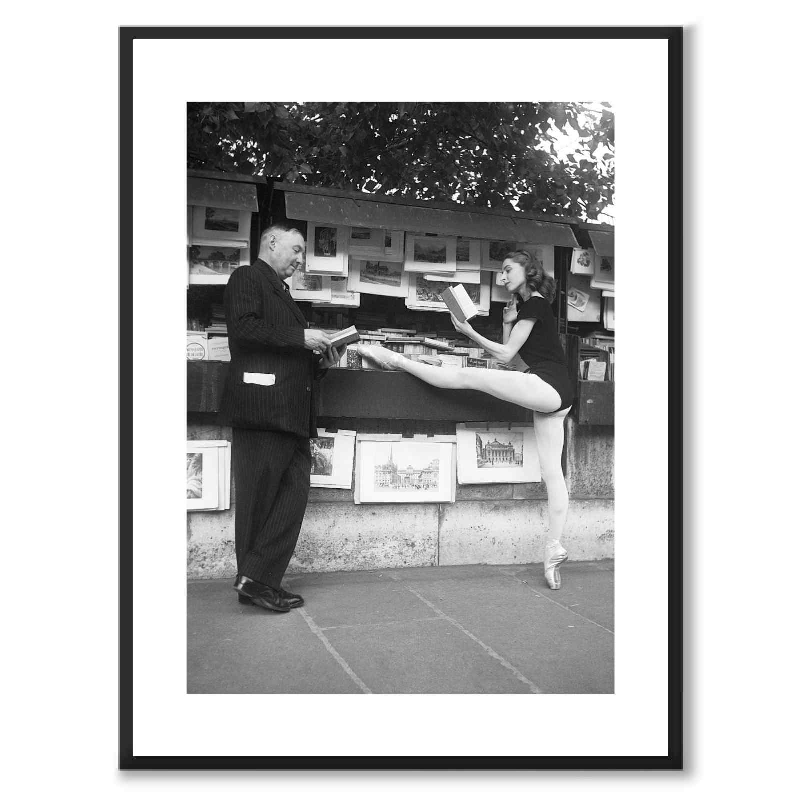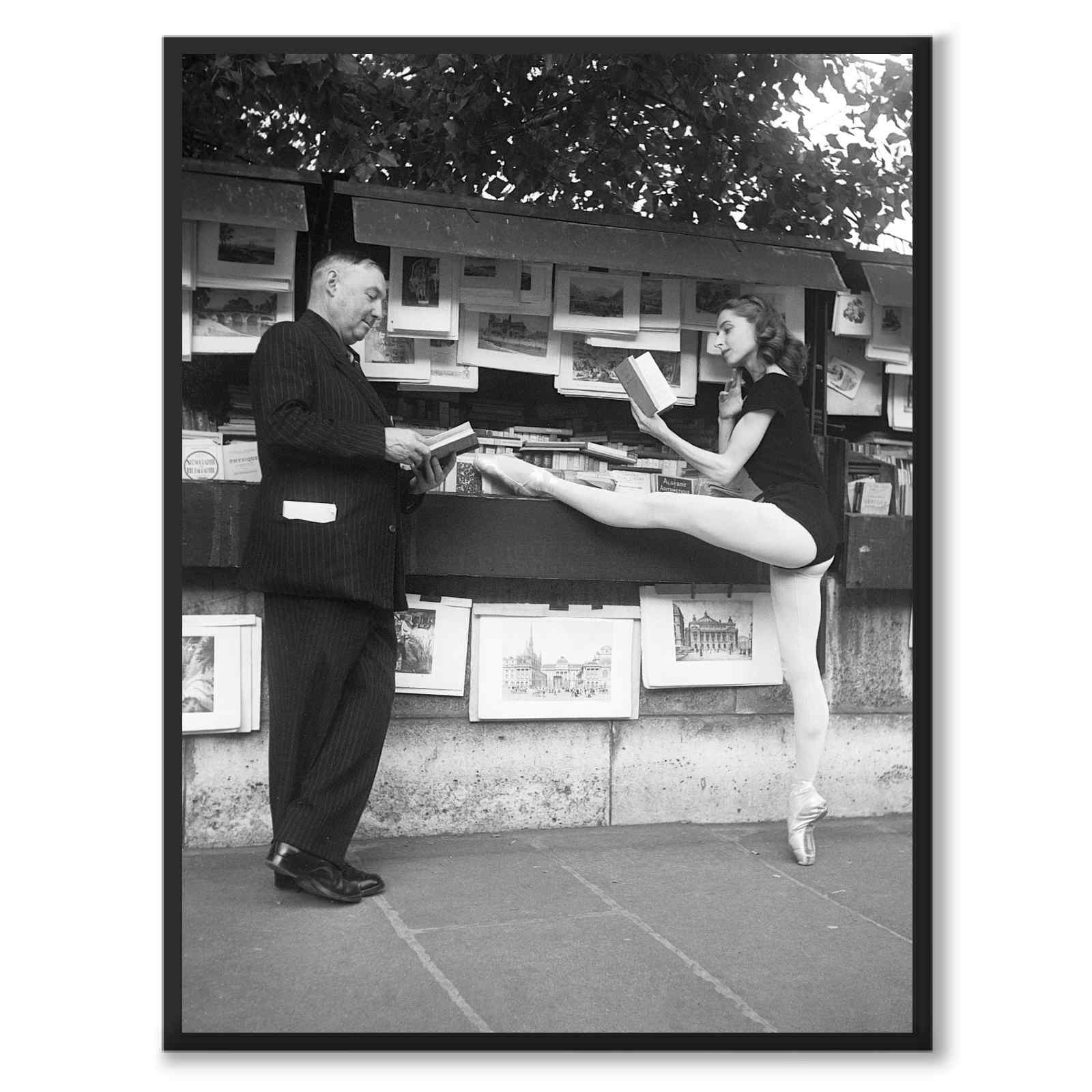 Plakat med et kunstnerisk bilde av Ellen Rasch (1920-2015) som var en svensk danser, ballettlærer og skuespiller. Bildet er tatt i Paris hvor vi ser Rasch balansere på tærne til den ene foten, mens hun leser en bok i en bokhandlerbutikk.