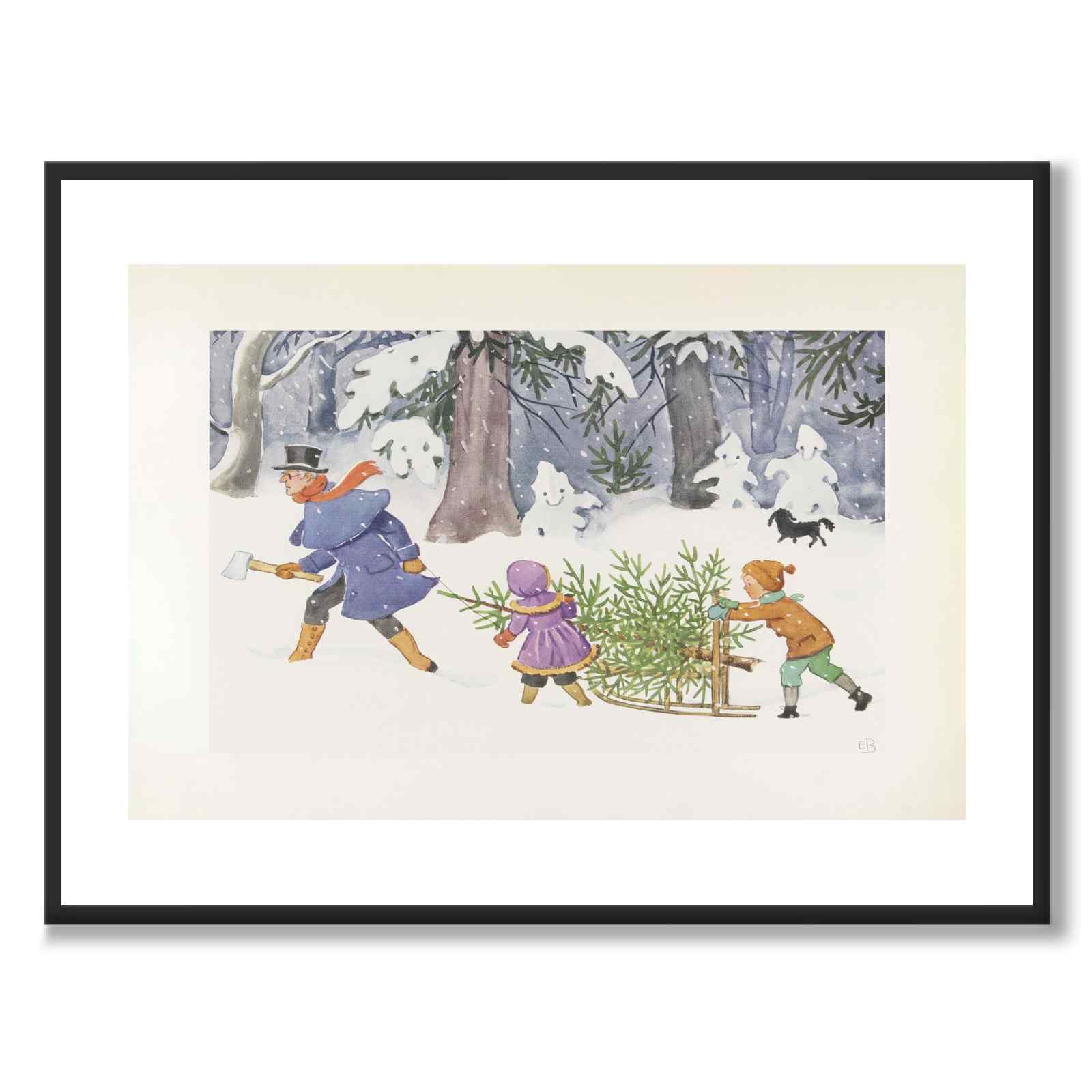 Illustrationen visar en vinterdag där en man går före i snön med en yxa i handen medan två barn drar och skjuter på en nyhuggen julgran på en liten kälke. Snön faller tätt mellan de stora träden och skapar en stillsam, nästan sagolik stämning. I bakgrunden syns en liten hund som springer genom den djupa snön och förstärker känslan av rörelse och lek mitt i vinterlandskapet.