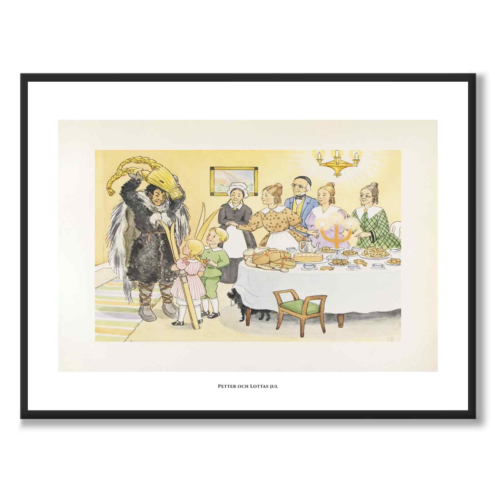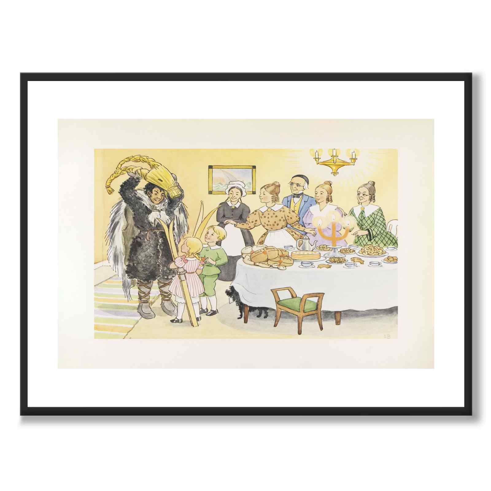 Illustrationen visar en stämningsfull julscen där familj och gäster samlas runt ett dukat bord fyllt med bröd, kakor och julens bakverk. Två barn står intill den traditionellt klädda figuren med kvastar och pälsdräkt och betraktar honom med både nyfikenhet och förtjusning. Rummet är varmt upplyst och fyllt av detaljer som förstärker den festliga atmosfären från julgransljus till omsorgsfullt dukade koppar och fat.
