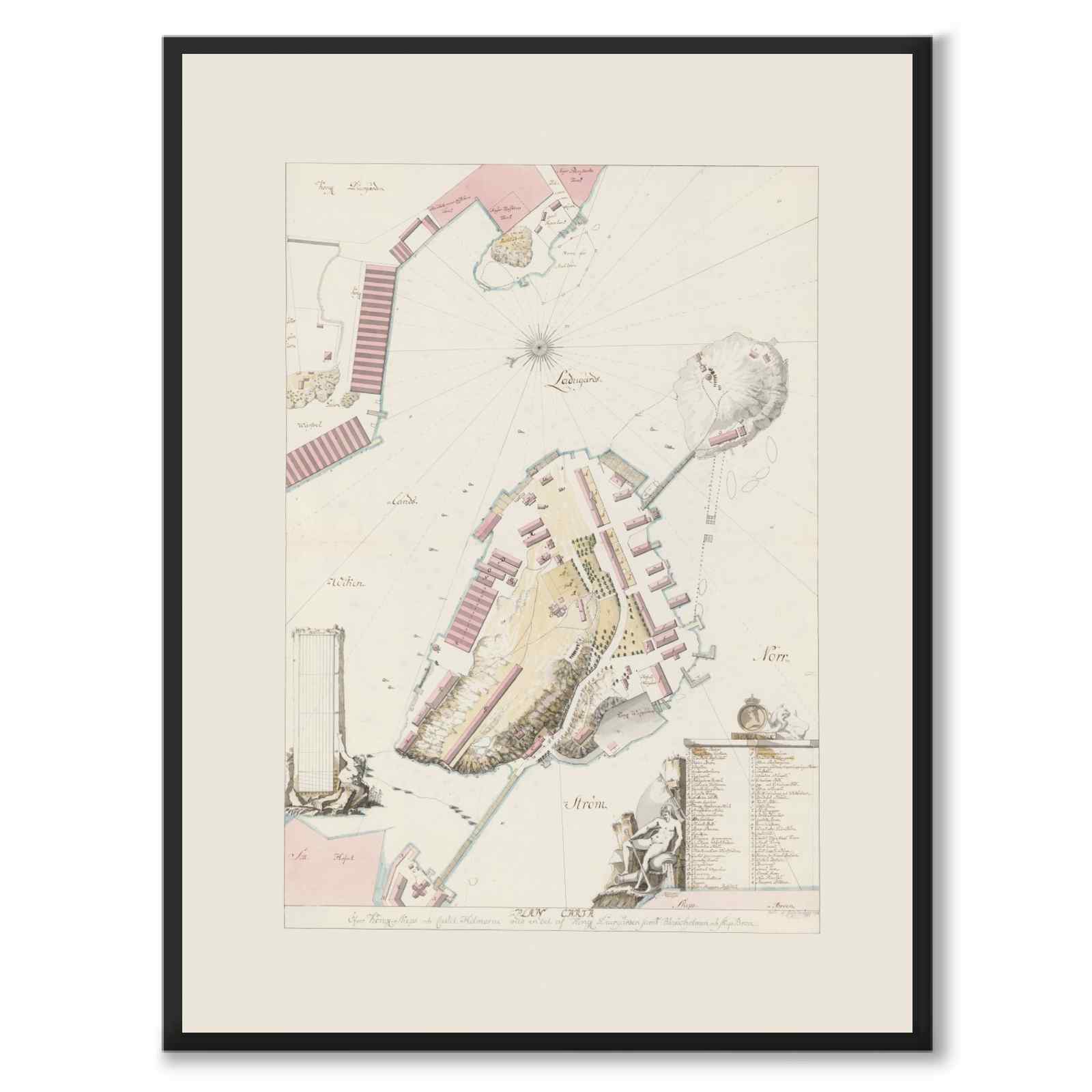 Plakat med gammelt plankart over en del av Stockholm fra 1792. Det detaljerte kartet er håndtegnet og viser hovedsakelig Skeppsholmen og Kastellholmen .