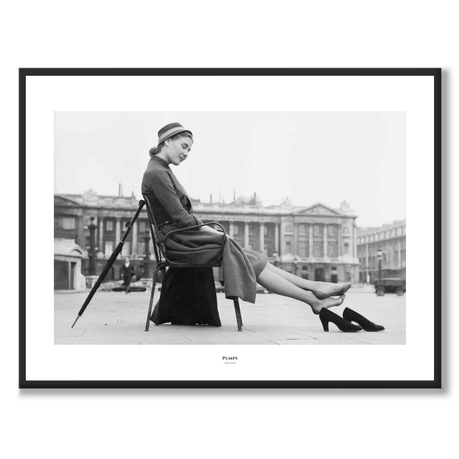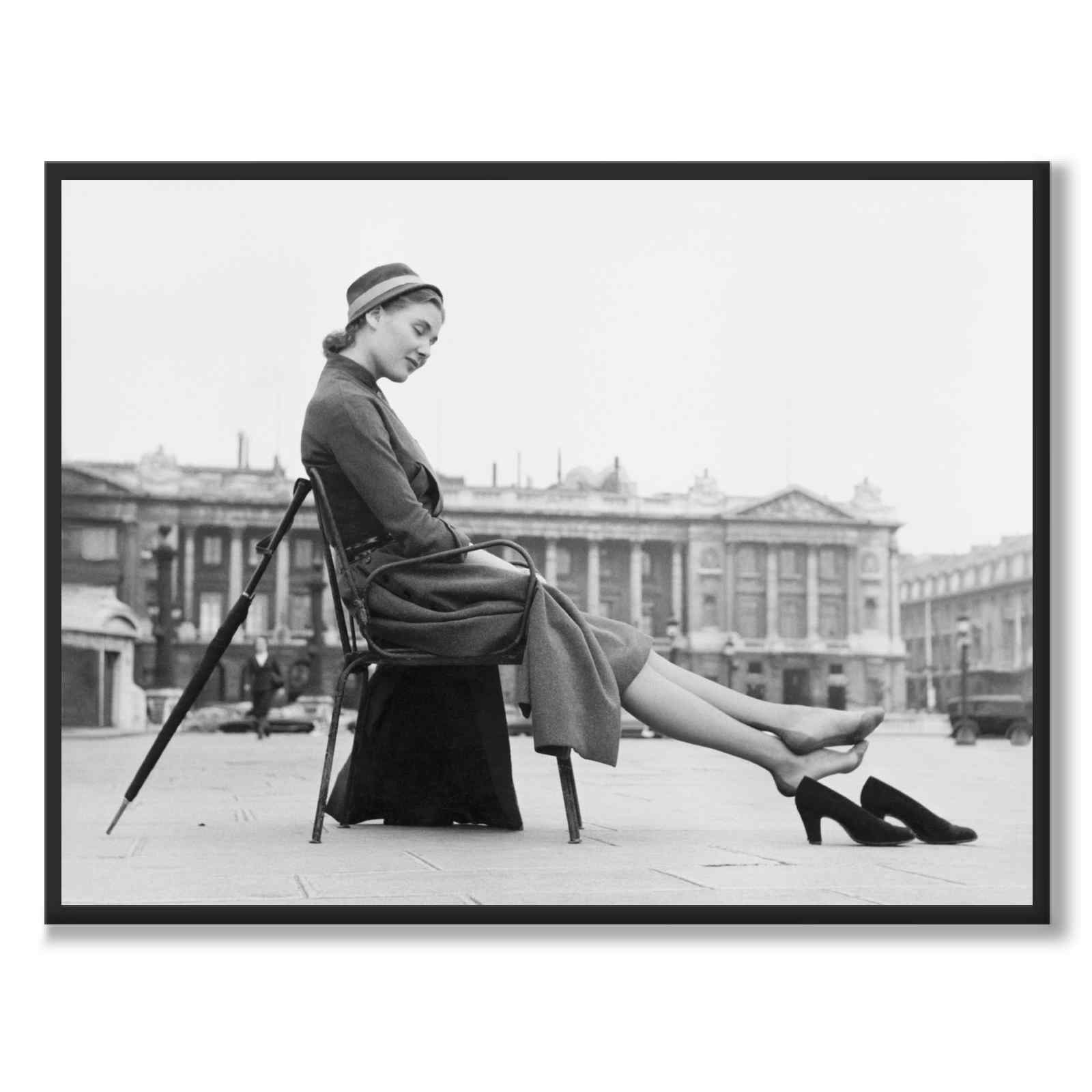 På bildet, tatt en gang mellom 1950-1955, ser vi en kvinne i en stilkjole og hatt sitte på en stol på en firkant og ha tatt av seg pumpene. En paraply lener seg mot stolryggen.