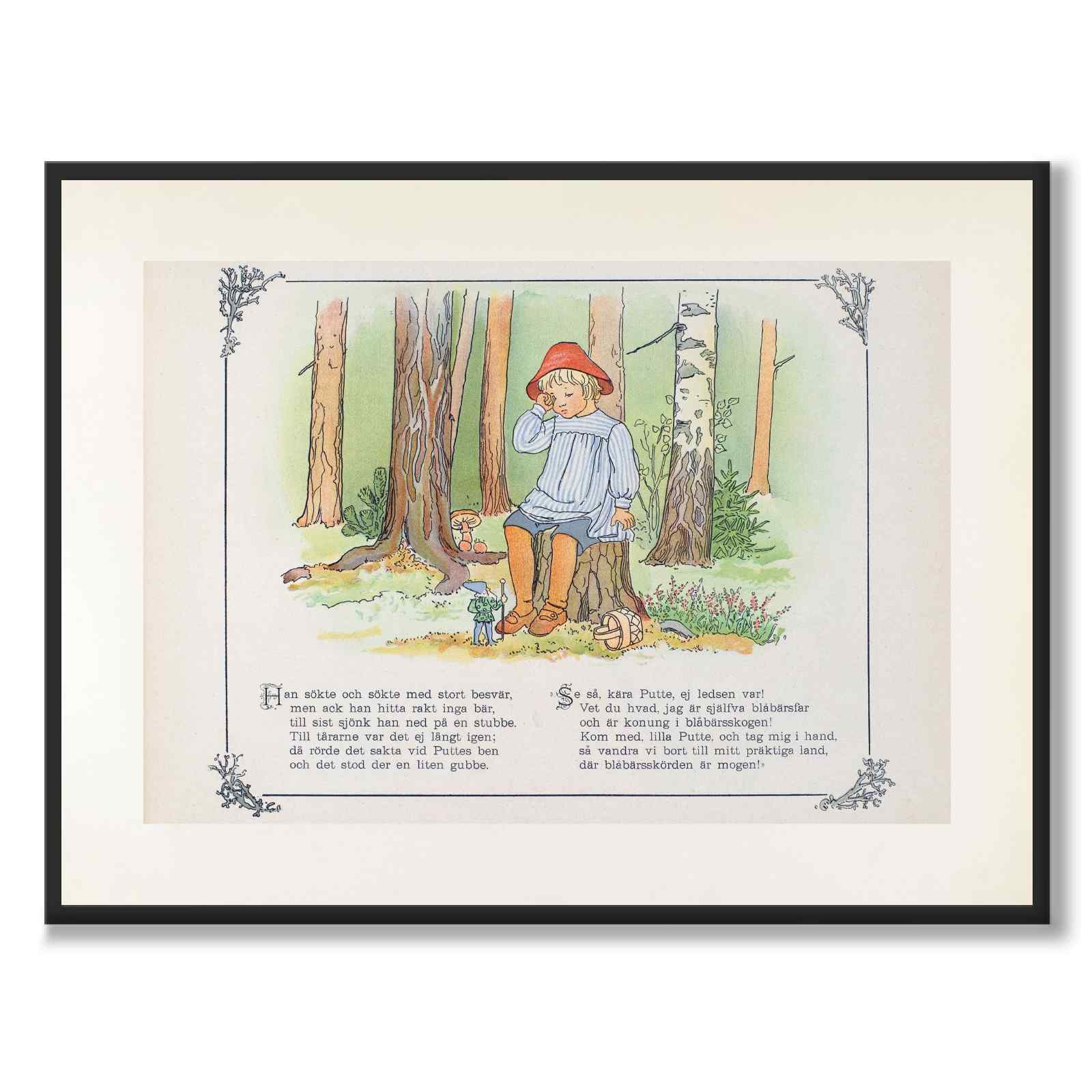 Plakat med illustrasjon fra Puttes Äventyr i Blåbärsskogen, en elsket svensk barnebok skrevet og illustrert av Elsa Beskow, fra år 1901. Den er et av Beskows mest kjente verk og regnes som en klassiker i svensk barnelitteratur.