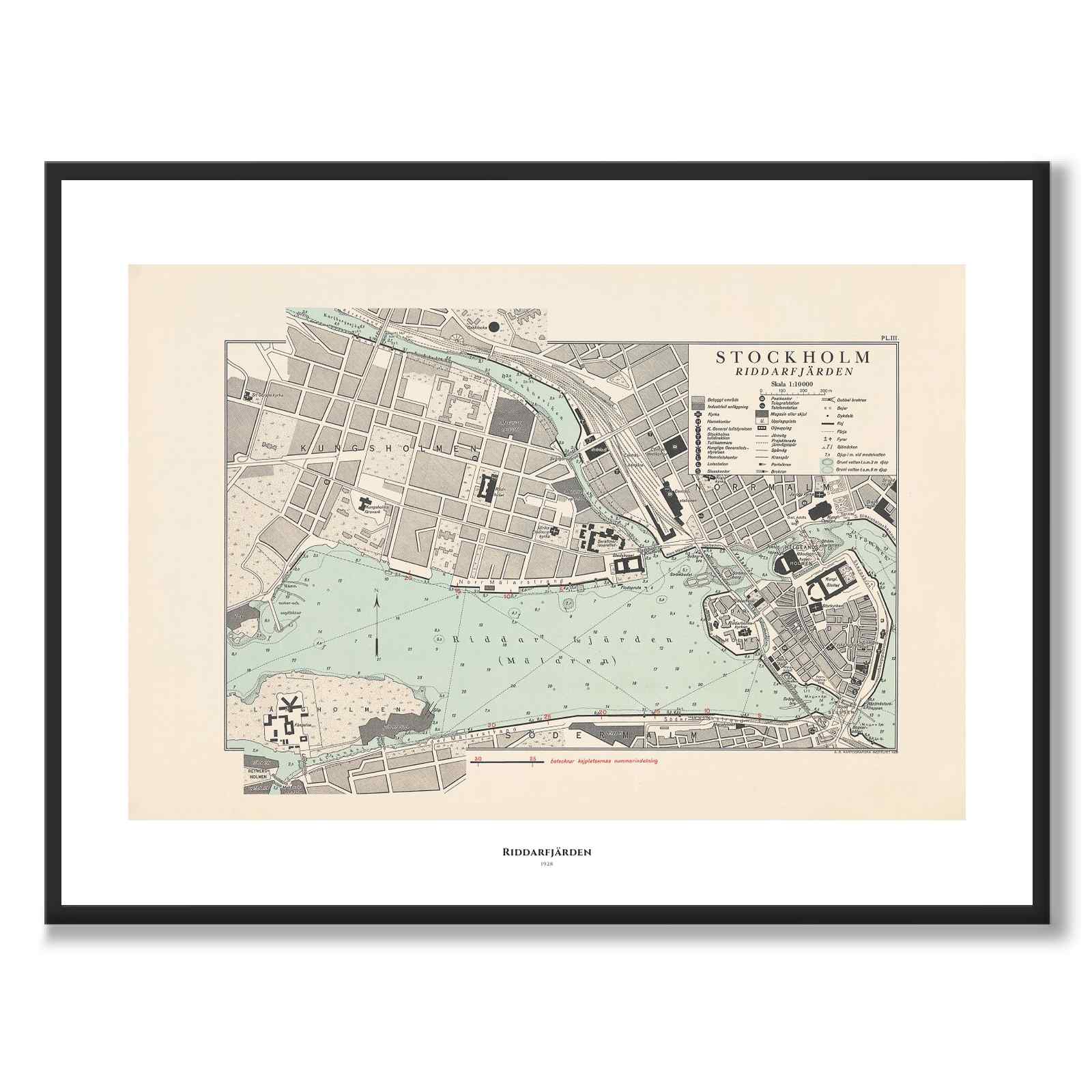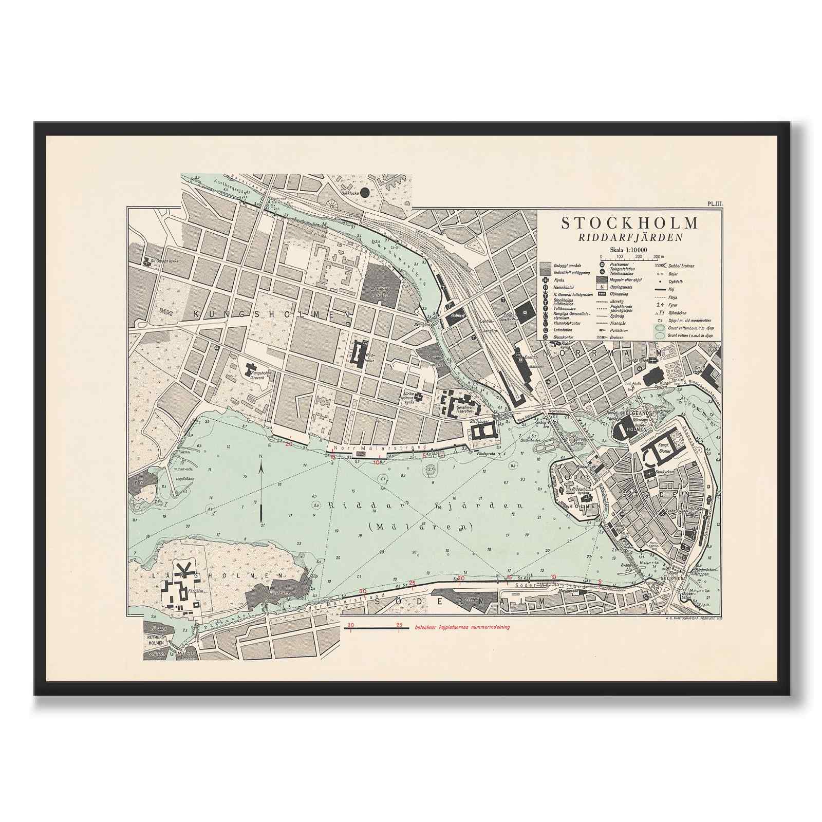 Plakat med kart over gamle Riddarfjärden i Stockholm i 1928.