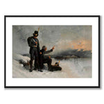 Plakat med det fengslende maleriet Scene from the Finnish War , laget i 1874 av Albert Edelfelt. Maleriet viser to menn under den finske krigen, en stående soldat som skal rapportere og en sittende mann som holder opp hånden.