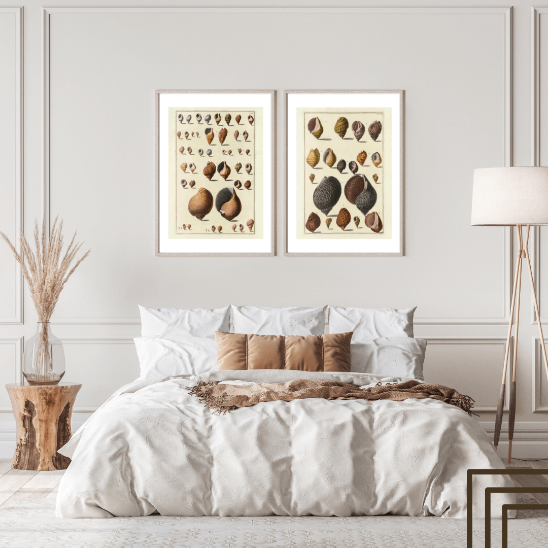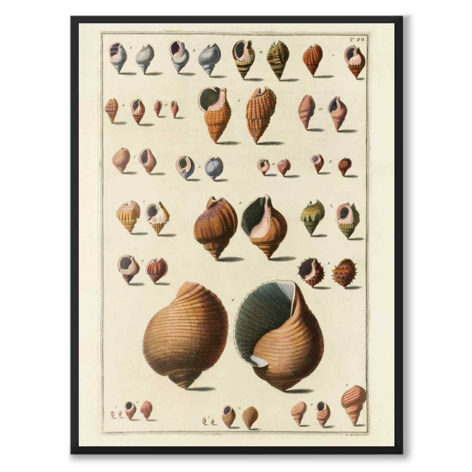 Plakat med et vakkert kart over ulike skjell fra 1800-tallet. Et tjuetalls typer skjell er illustrert forfra og bak med tilhørende nummerering.