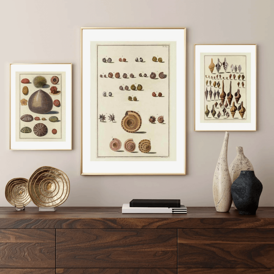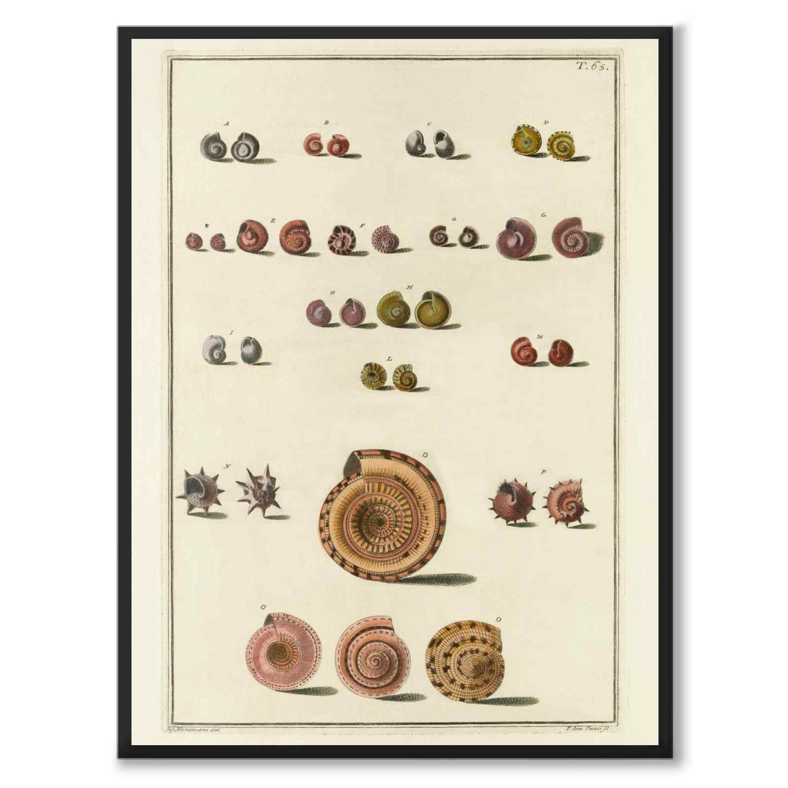 Plakat med et vakkert kart over ulike skjell fra 1800-tallet. Femten skjelltyper er illustrert forfra og bak med tilhørende nummerering.
