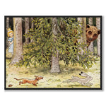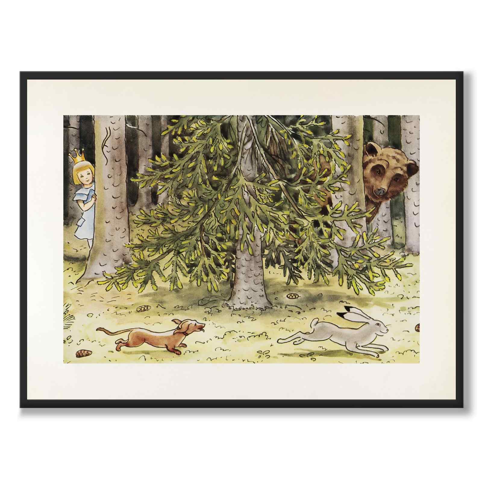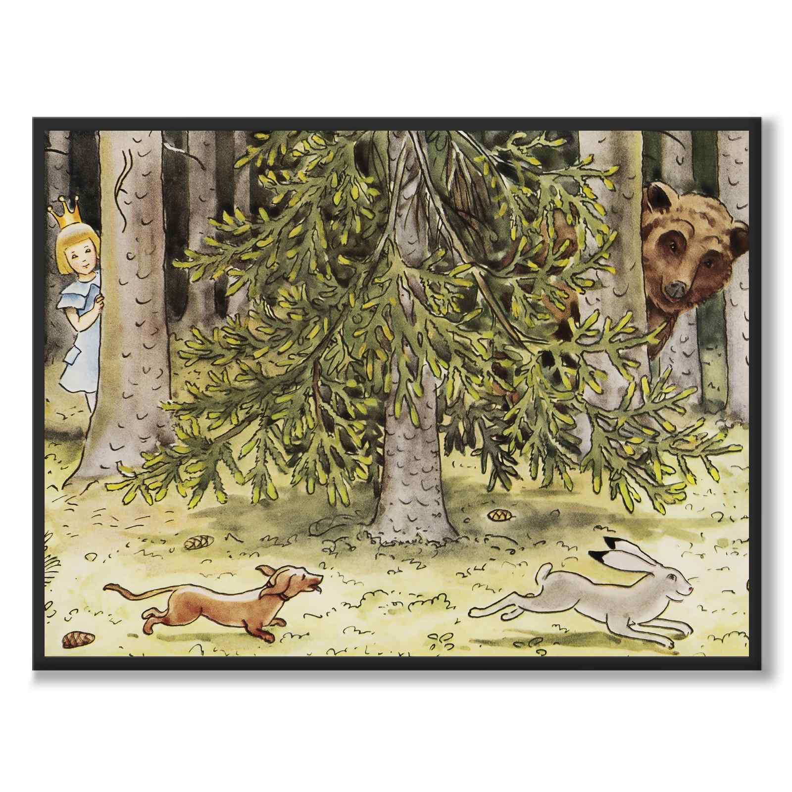 Bilden visar en scen i skogen där prinsessan kikar fram bakom ett träd. I fokus jagar en liten tax en vit hare över marken, och bakom granens grenar skymtar en björn som tittar fram mellan stammarna.
