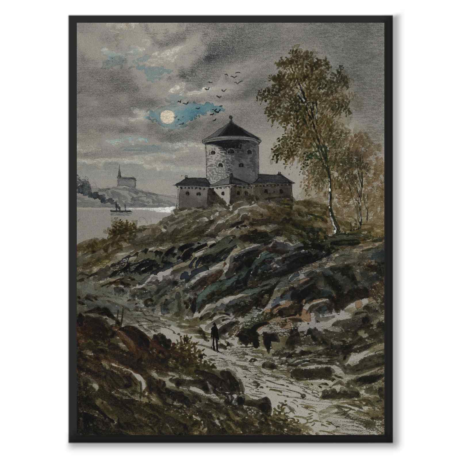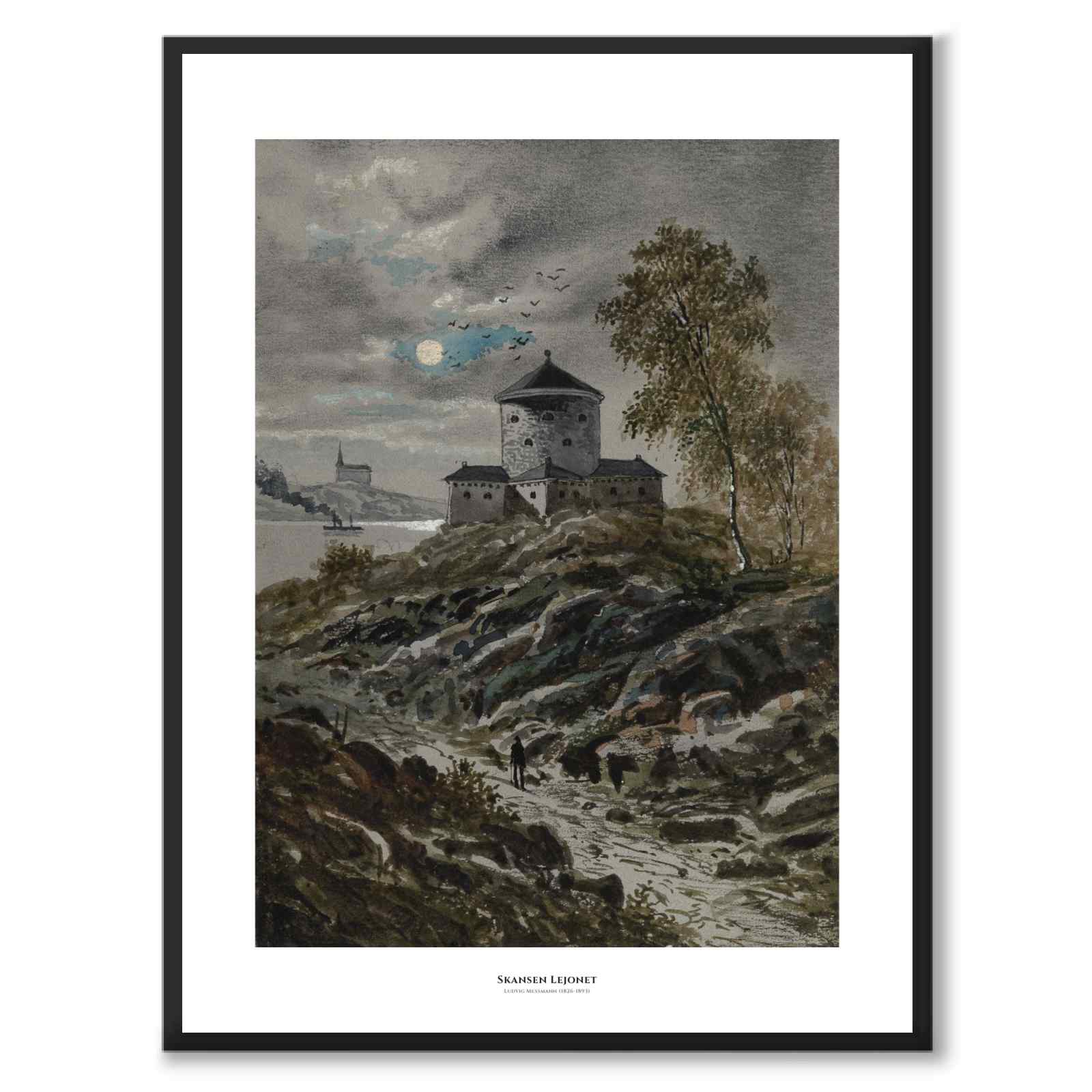 Plakat med et vakkert maleri av Skansen Lejonet i Gøteborg. I bakgrunnen kan du se Gullbergsån og Sankt Pauli kirke. Kunstverket ble skapt av den danske kunstneren Ludvig Messmann i 1890 og er en del av en hel serie vakre Gøteborg-motiver.