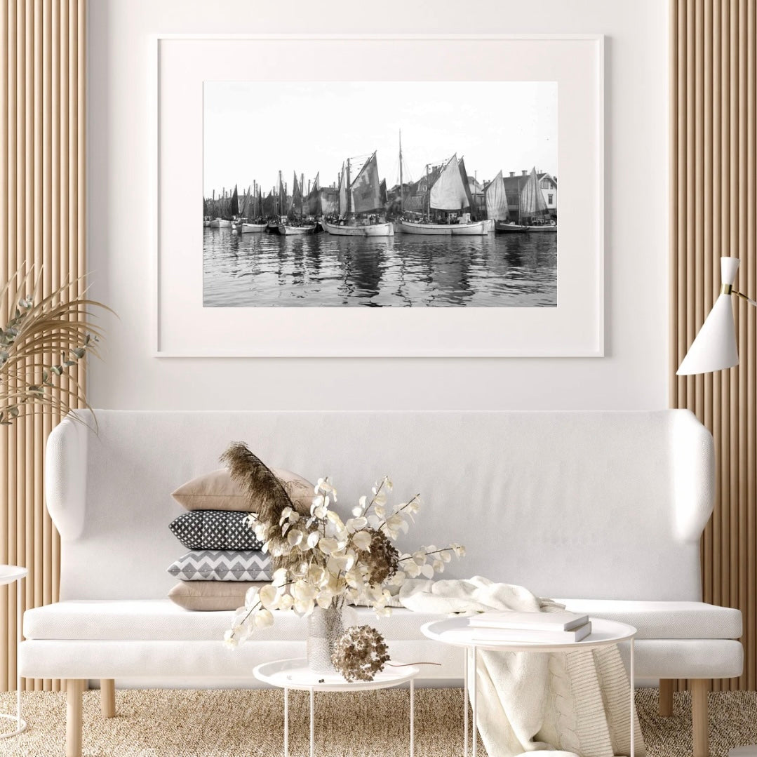 Plakat med motiver fra Smögen i 1924. Flere makrellbåter ligger ved Smögens havn og venter på fiskeauksjon.