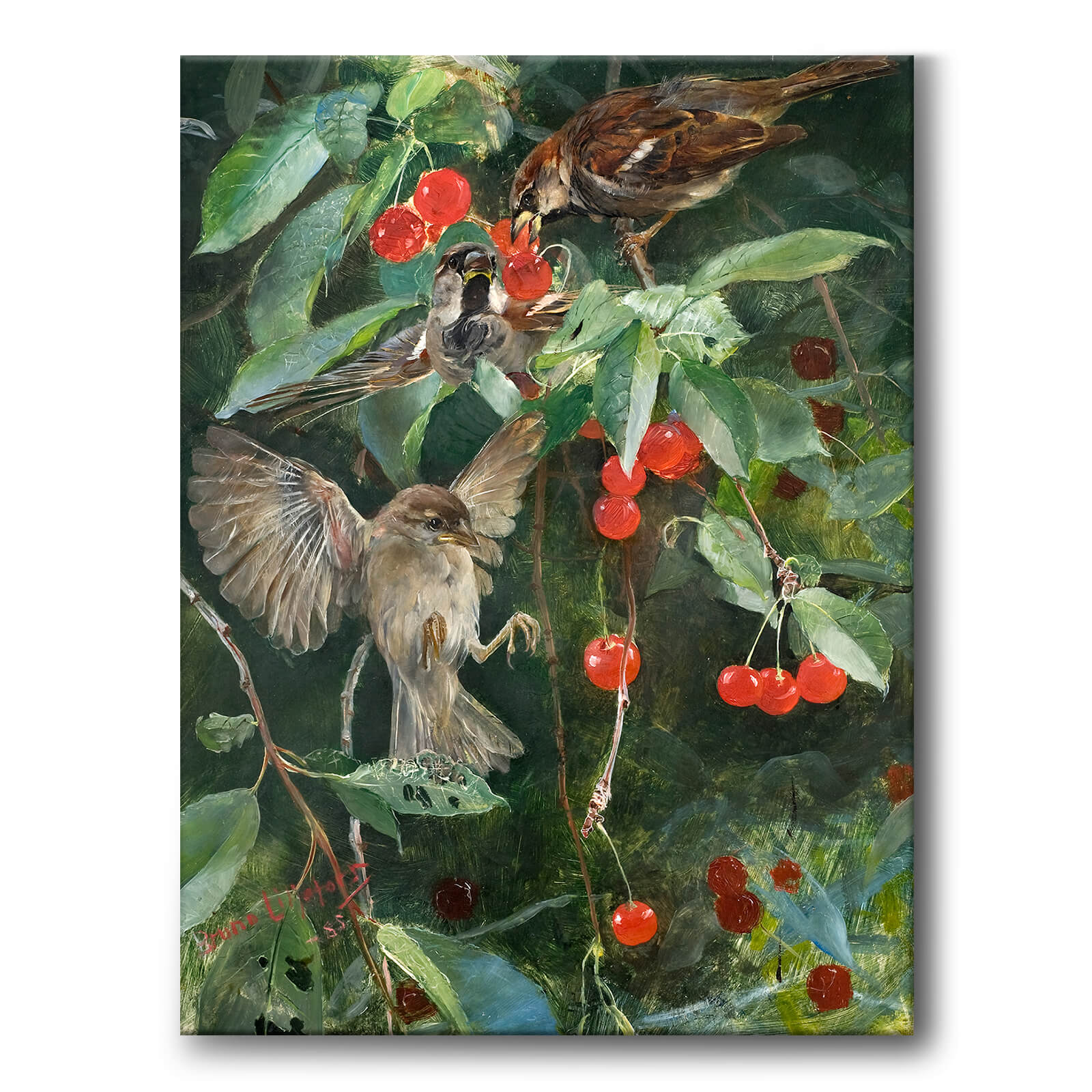 Lerret med maleri av Bruno Liljefors som viser to gråspurver i et kirsebærtre.