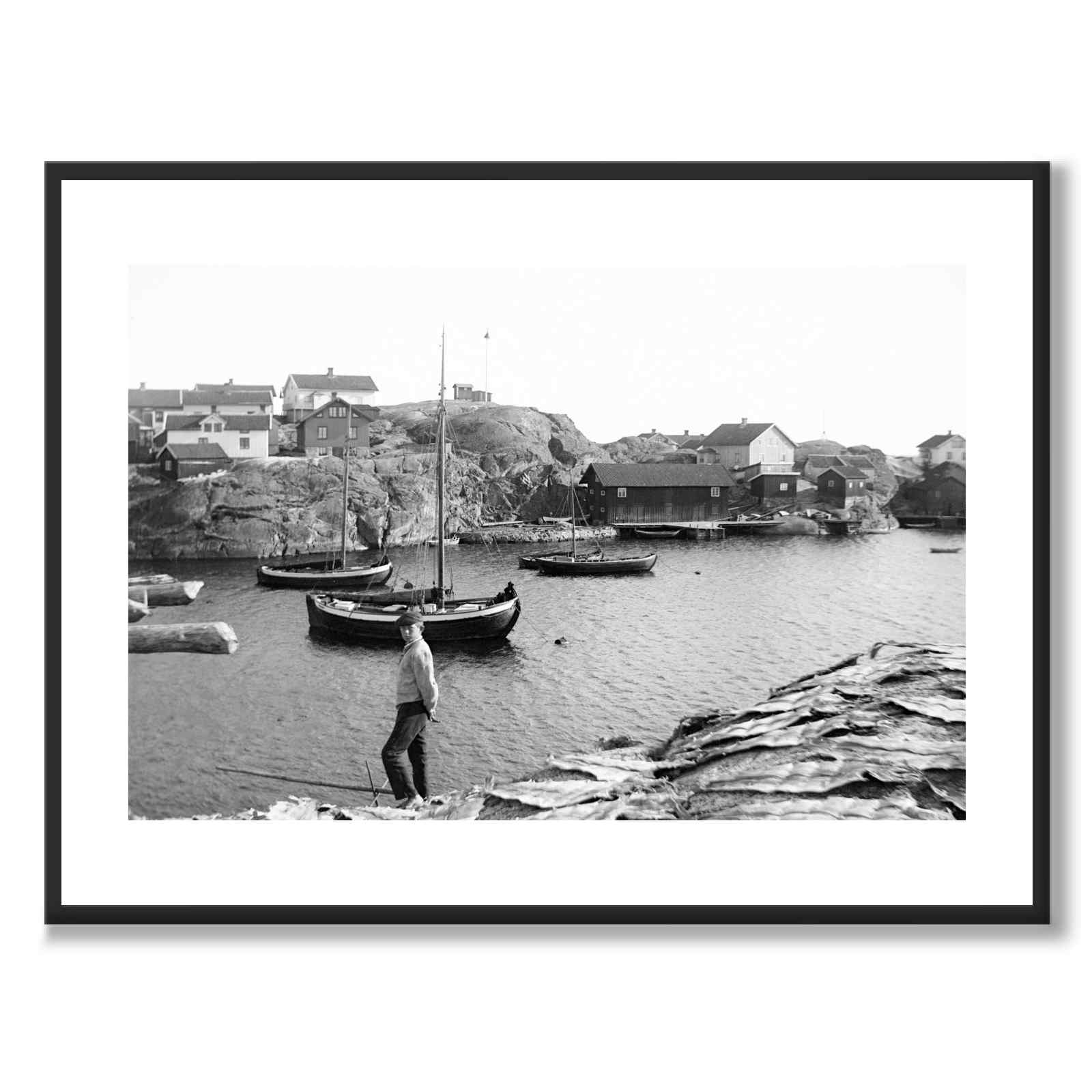 Klädesholmen er en øy og tettsted i Tjörn kommune. Fjellet vi ser i bakgrunnen er Klockarberget, og den lille bygningen på fjellet til høyre for yachtens mast er den gamle losposten.