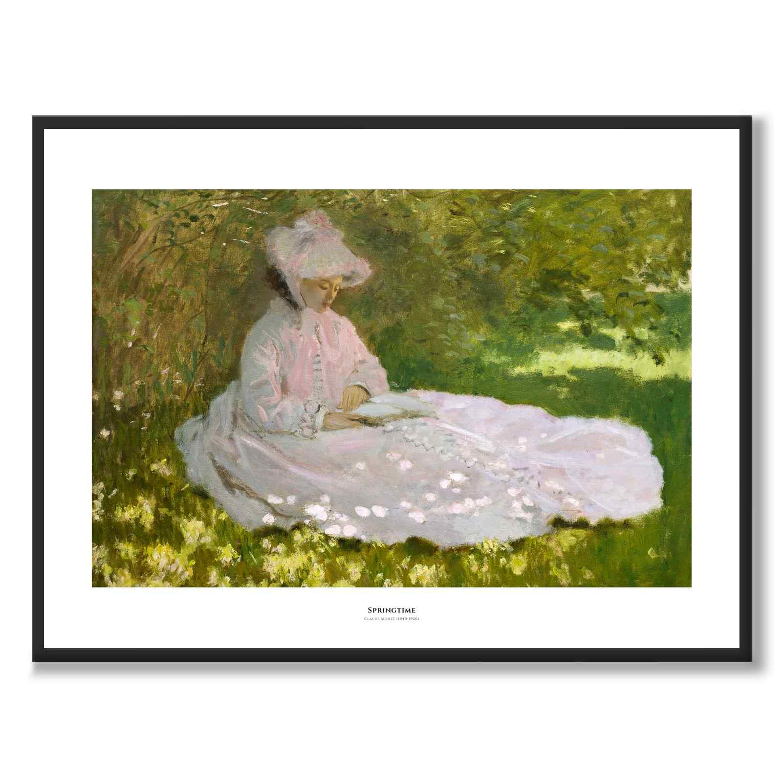 Plakat med maleriet Springtime av Claude Monet fra 1872. Motivet er en nydelig vårdag der en ung kvinne sitter i gresset og leser.