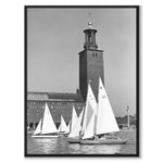 Plakat med et vintagefotografi av Stockholms rådhus i 1938.