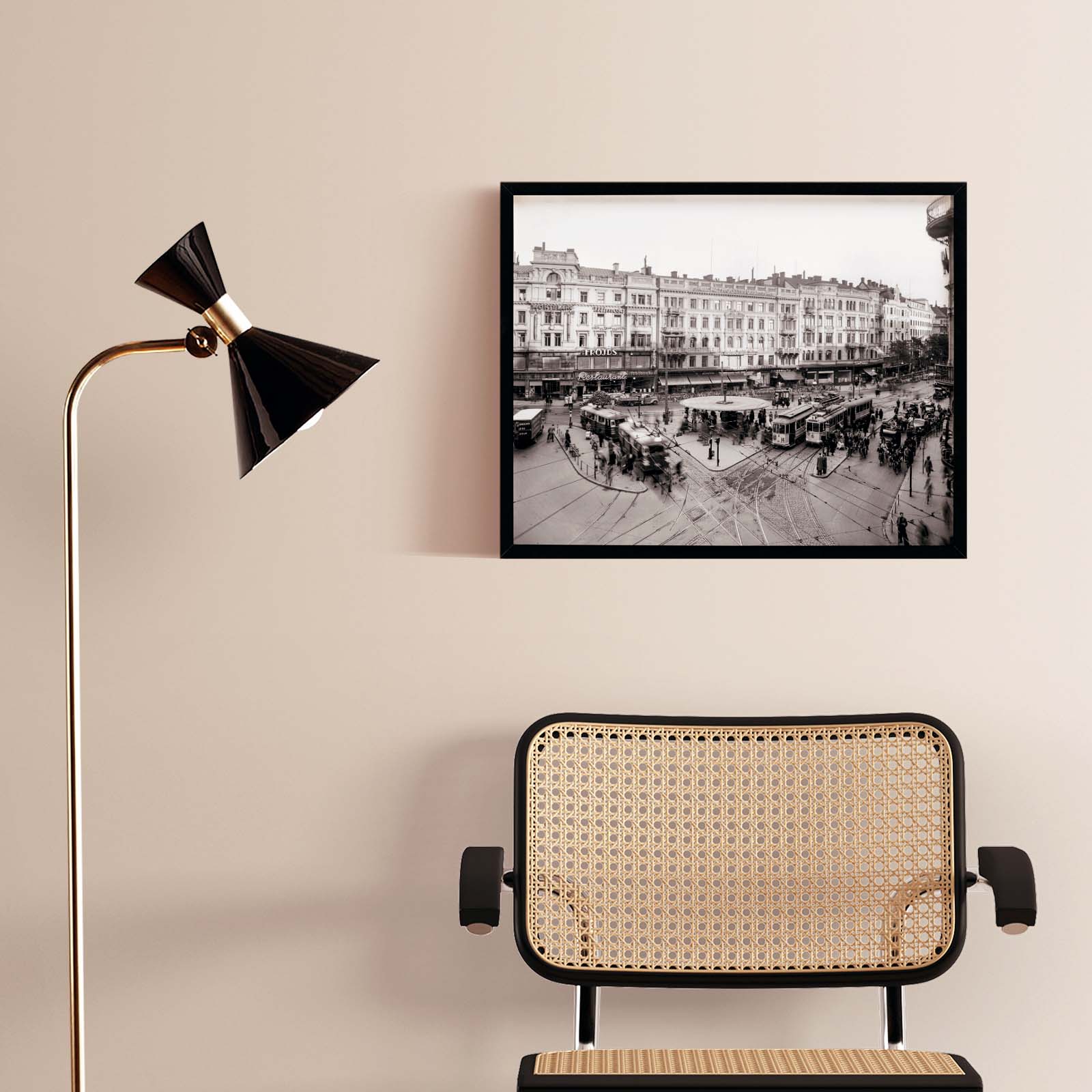 Plakat med foto av Stureplan fra det som trolig er tidlig på 1940-tallet. Bildet viser blant annet den karakteristiske «Soppen» som ble bygget i 1937. På bildet møter trikker og trikker et yrende folkeliv.