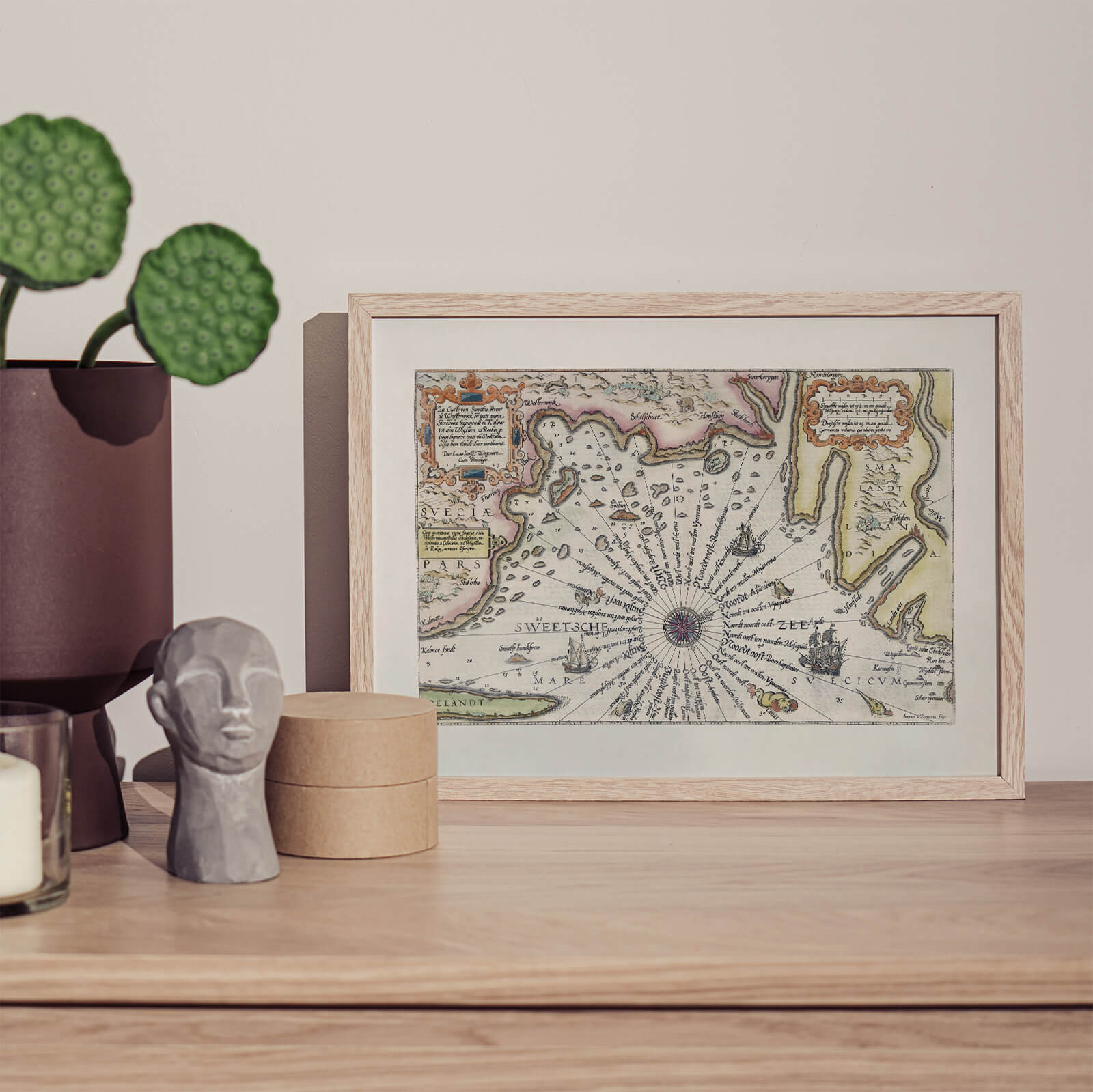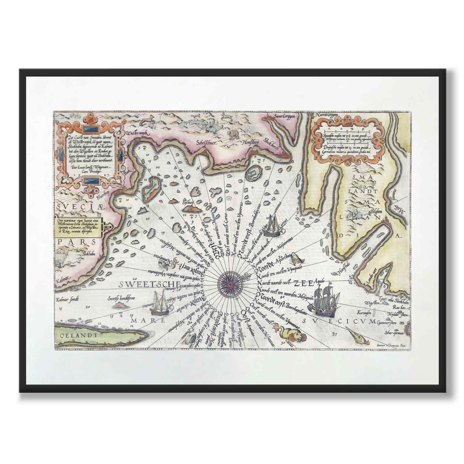 Plakat med nederlandsk kart over Sveriges østkyst på 1500-tallet. På kartet ser du blant annet Kalmar og Stockholm.