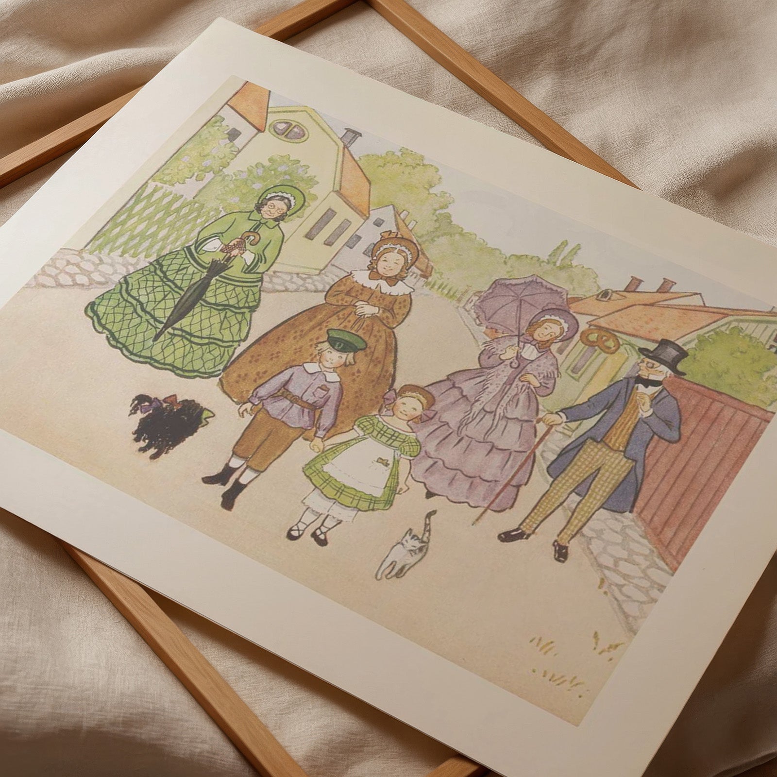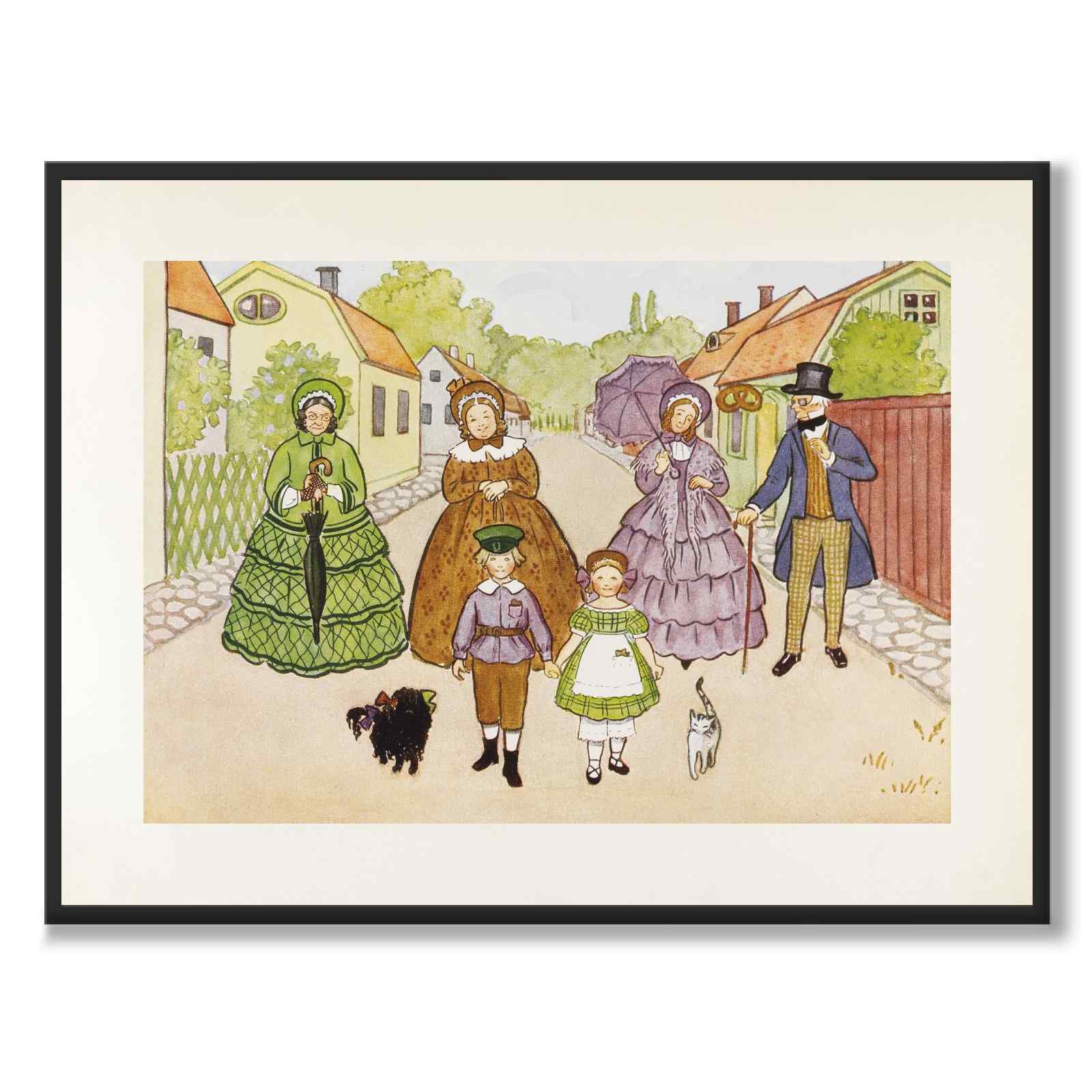 Illustrasjonen viser Tant Grön, Tant Brun og Tant Gredelin som går sammen. Onkel Blå, gutten, jenta og den lille hunden deres langs en idyllisk landsbygate. Den sjarmerende og livlige scenen utstråler en sterk følelse av fellesskap og varme, perfekt innrammet av landlige omgivelser.