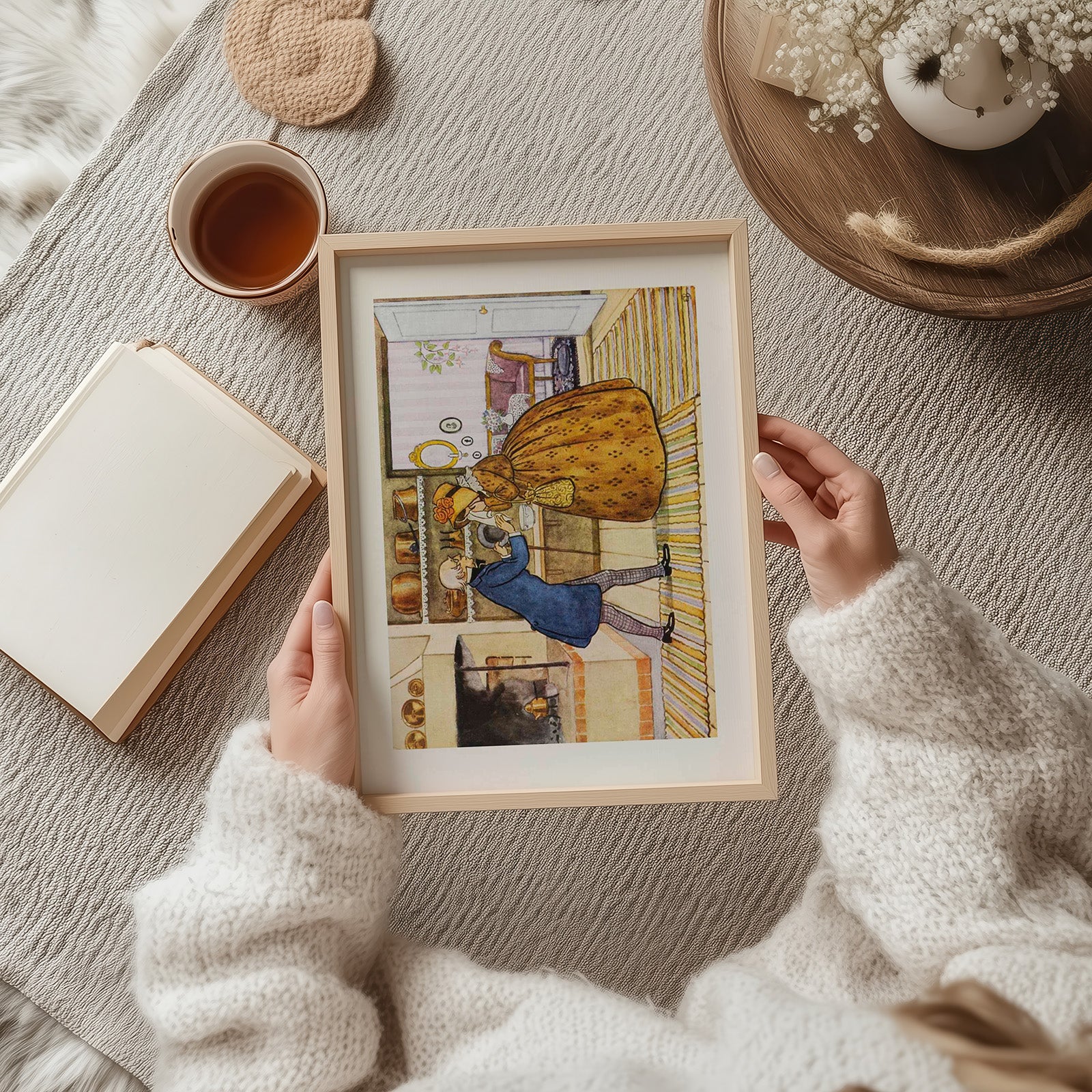 Illustrasjonen viser en scene der onkel blå og tant Brun står på et kjøkken. Tant Brun ser både trist og opprørt ut, mens onkel blå prøver å trøste henne med en vennlig gest. Omgivelsene er varme og hjemmekoselige, med en peis som sprer varme og en bokhylle fylt med kjøkkenutstyr som gir rommet en følelse av sjarmerende hverdagslighet.