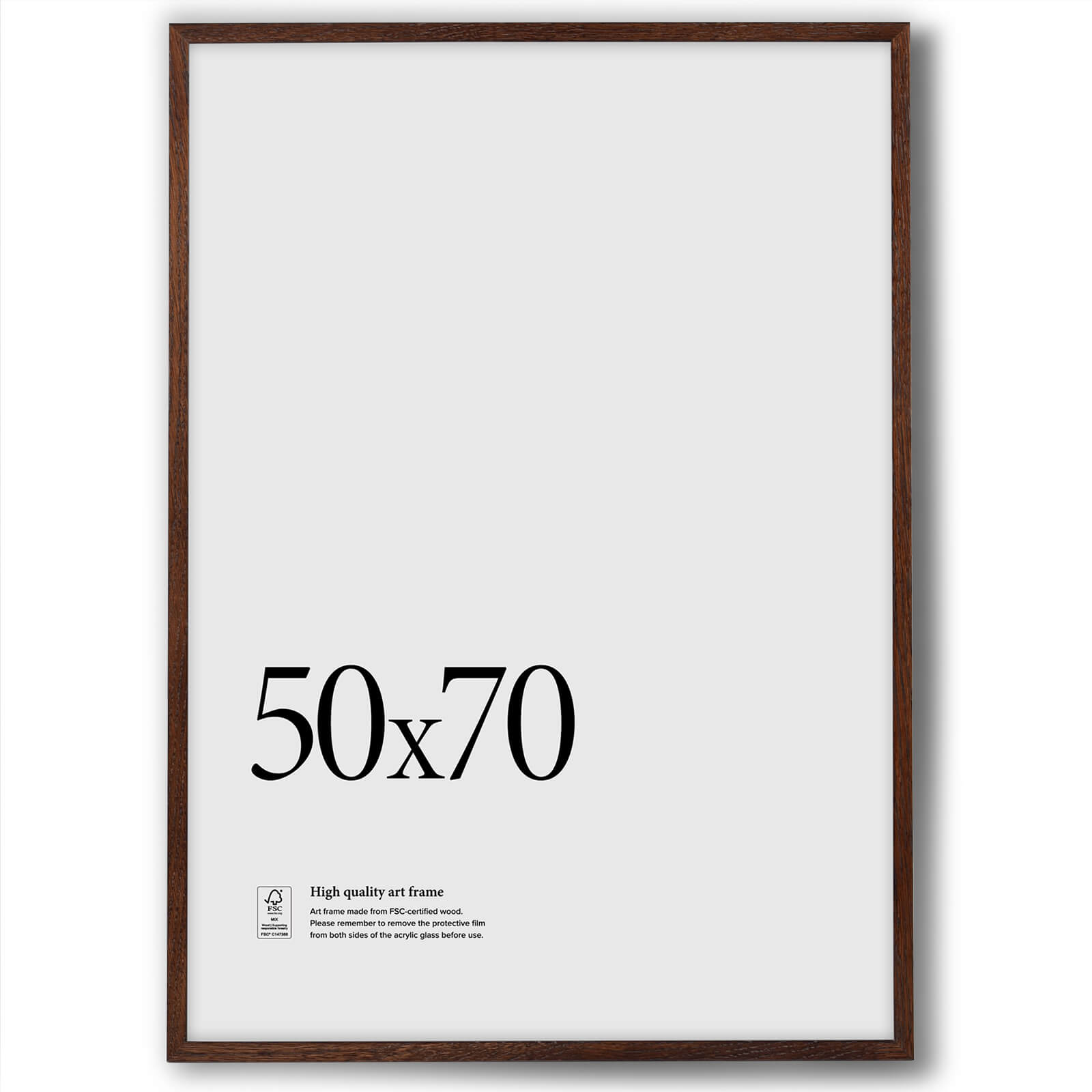 Denne bilderammen i mørkglasert tre kommer med krystallklart 1,5 mm pleksiglass og passer perfekt til plakater i størrelsene 30x40, 50x70 og 70x100. Eik er et levende materiale som gjør hver bilderamme unik. Bredden på trerammen er 12 mm og dybden er 20 mm . Alle rammer har metallhengere på baksiden, noe som betyr at de kan henges både vertikalt og horisontalt. Rammen har vriklips på baksiden, noe som gjør innrammingen veldig enkel og fleksibel.