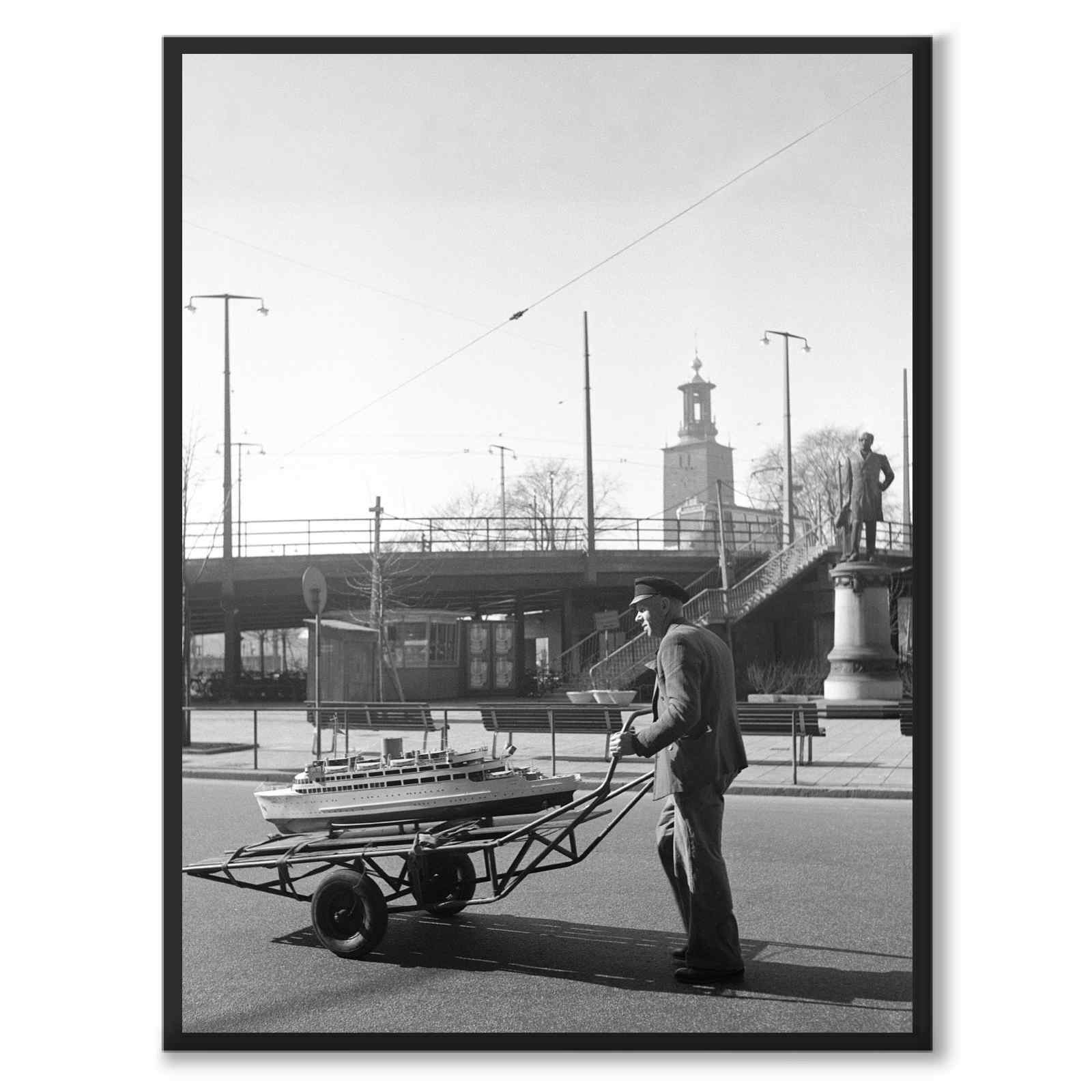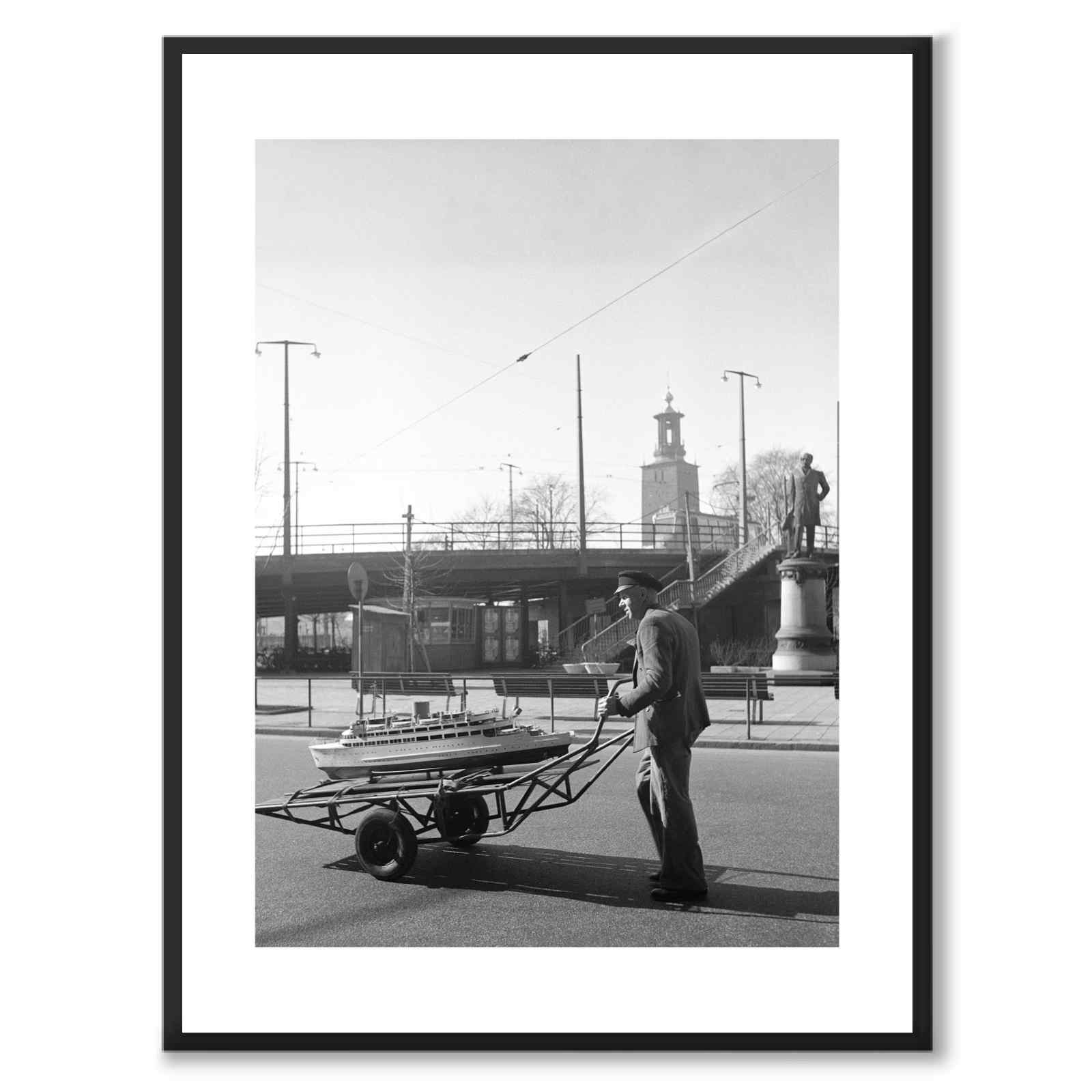 Plakat med et gammelt fotografi fra Stockholm på 1950-tallet. Svart-hvitt-bildet er av en mann som frakter et modellskip på en håndkjerre.
