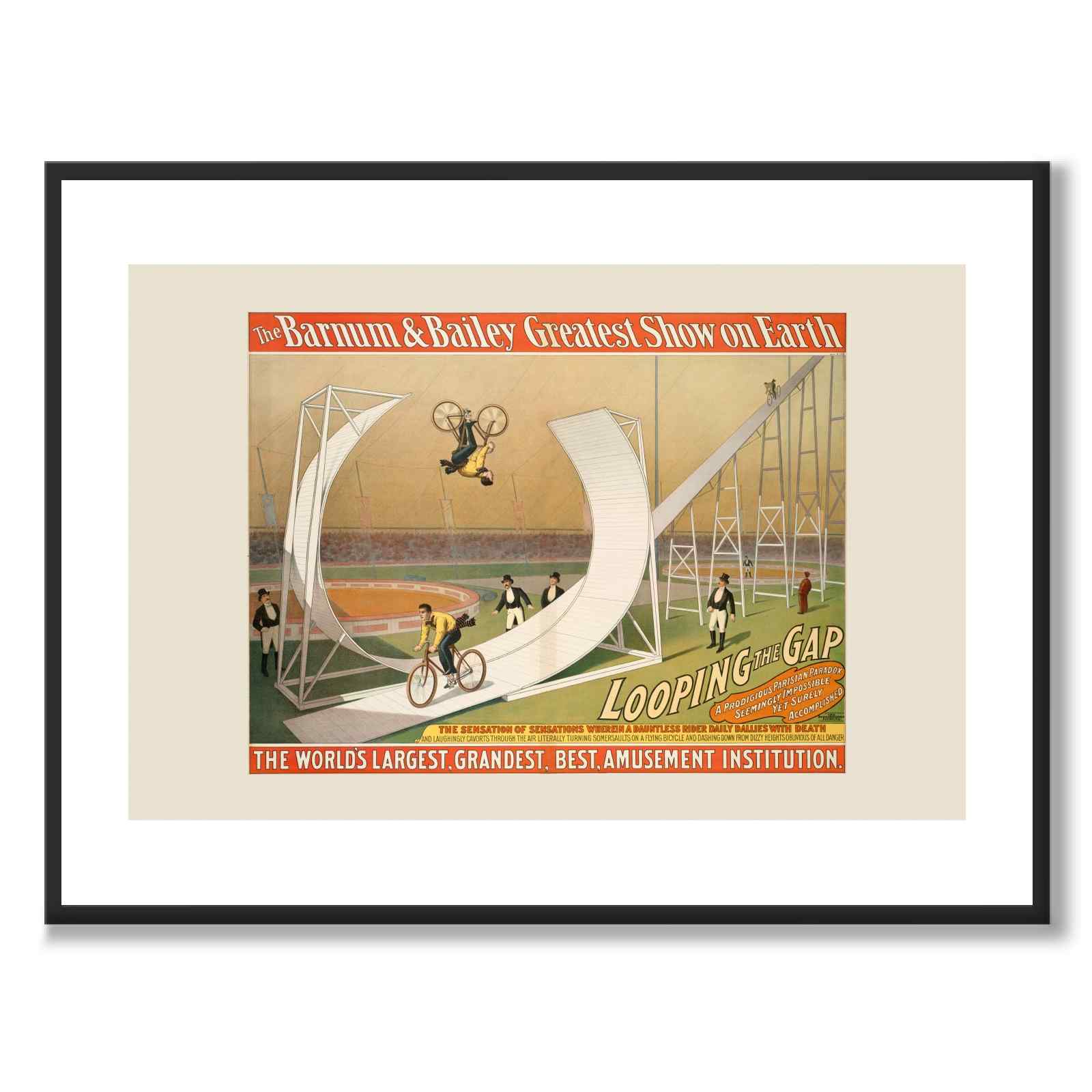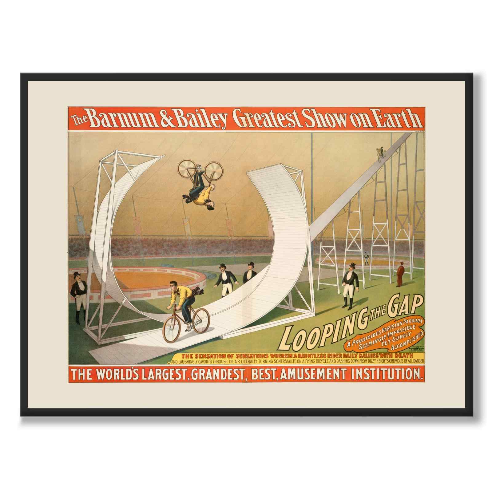 Illustrasjonen viser en spektakulær handling fra Barnum & Baileys Greatest Show on Earth, et av verdens mest kjente sirkus. på slutten av 1800-tallet og begynnelsen av 1900-tallet. Plakaten viser en fantastisk looping-akt kalt "Looping the Gap", der en syklist utfører en farlig loop på en sykkel gjennom en stor rammestruktur.
