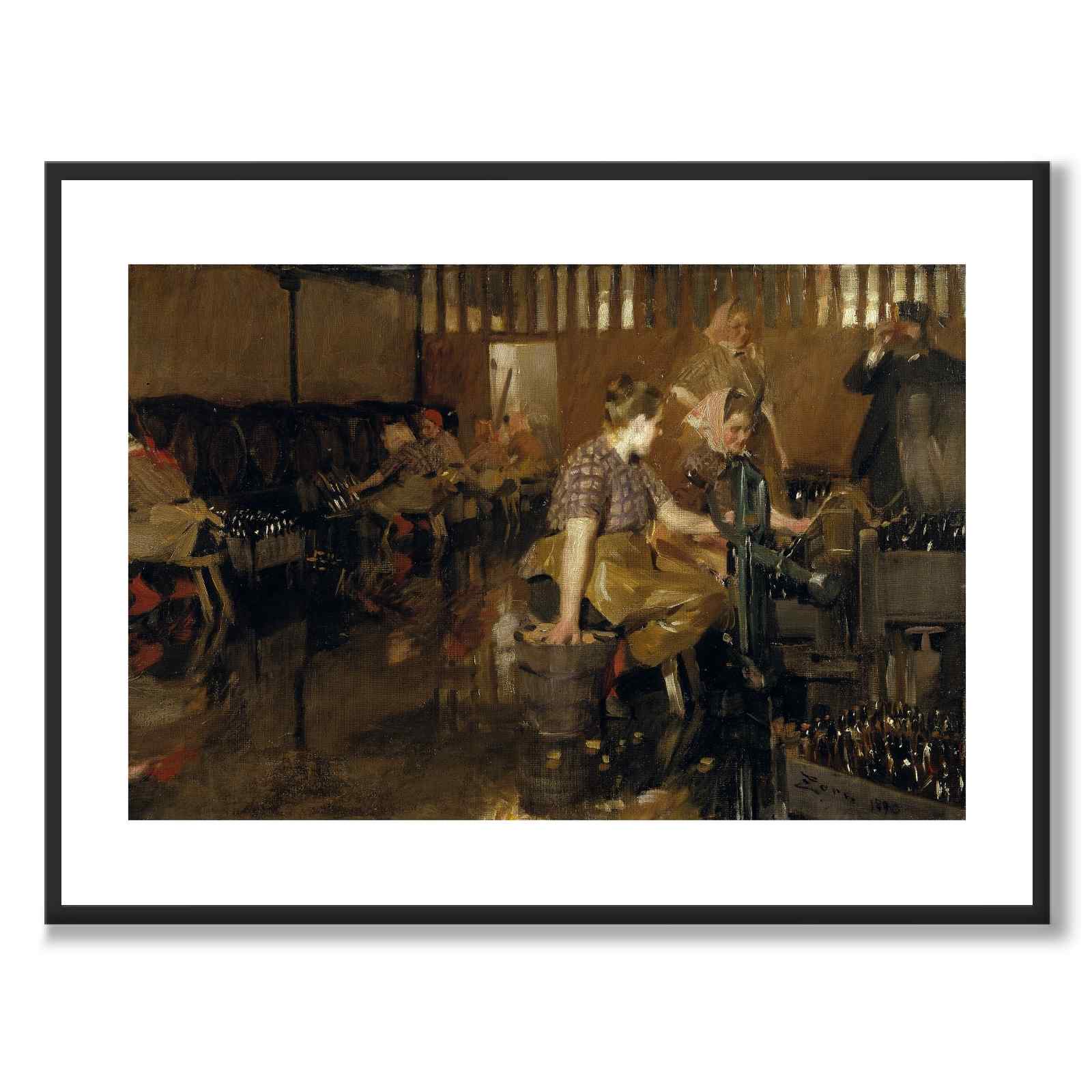 På bildet ser vi kvinnelige arbeidere på et bryggeri som tapper øl og forsegler flaskene med korker. I bakgrunnen sees en arbeidsleder som fører tilsyn med arbeidet. At kvinner jobbet i industrien var noe nytt i en tid da Sverige begynte å industrialisere seg. Arbeidet kunne være tungt og usunt, men Zorns maleri skal neppe oppfattes som samfunnskritikk. Han synes fremfor alt å ha vært interessert i å fange lyset, den fuktige luften og det konsentrerte arbeidet