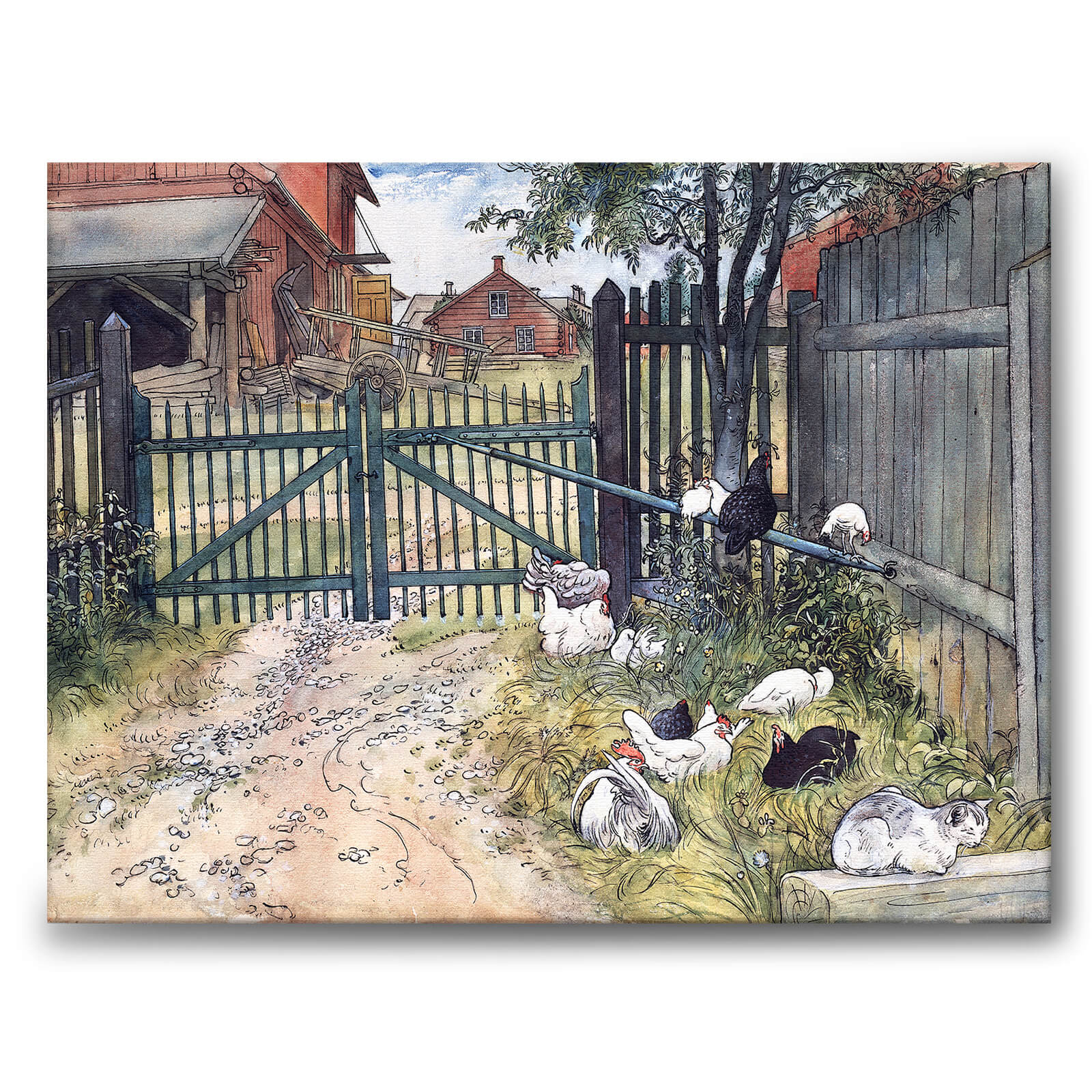 Lerret med maleriet Porten. Fra et hjem (26 akvareller) av Carl Larsson fra 1898. Carl Larsson er en av Sveriges mest elskede kunstnere gjennom tidene, kjent for sine karakteristiske akvareller som hyller et idyllisk familieliv. På maleriet ser vi en gård på landet, en katt og en hønseflokk.